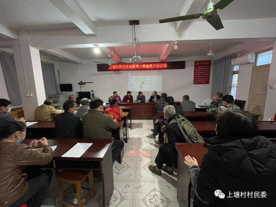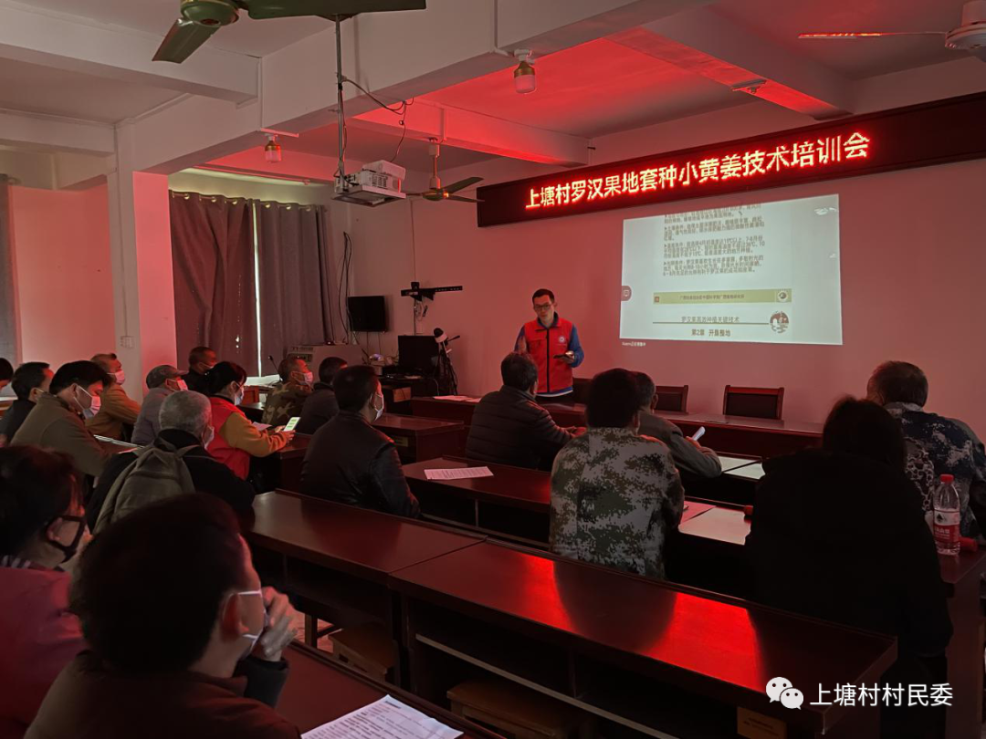 在上塘村村委会三楼会议室,甘金佳助理研究员为上塘村的村两委干部、全村罗汉果种植骨干教授罗汉果高效种植技术,就罗汉果种植过程的瓶颈问题、最新技术以及病虫害防治进行了讲解并与农户们进行了交流互动。随后蒋水元教授重点就罗汉果套种小黄姜的关键技术、小黄姜主要病虫害与防治方法及罗汉果与小黄姜生产存在的风险与应对措施等方面进行了讲解,农户们积极踊跃提问,提出自己的疑惑和见解,蒋水元教授一一进行了解疑答惑,整个座谈交流会持续了一个多小时,村民们求技若渴,因为时间关系最后不得不以最热烈的掌声结束了座谈会。