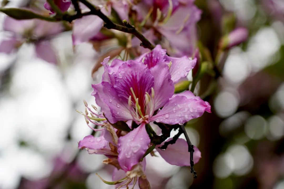 紫荆花瓣纷纷飘落下来,好像一场紫色的小雪。