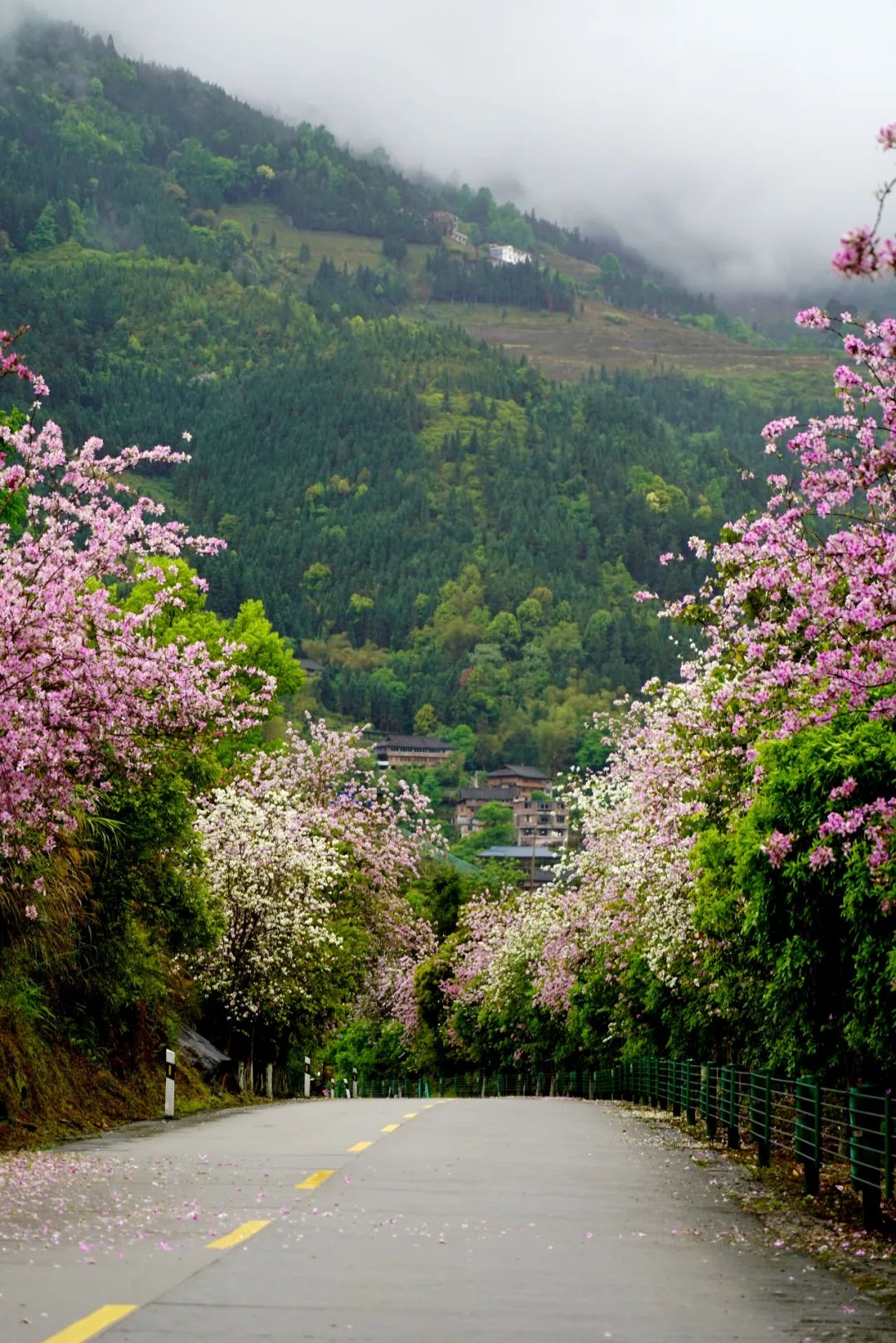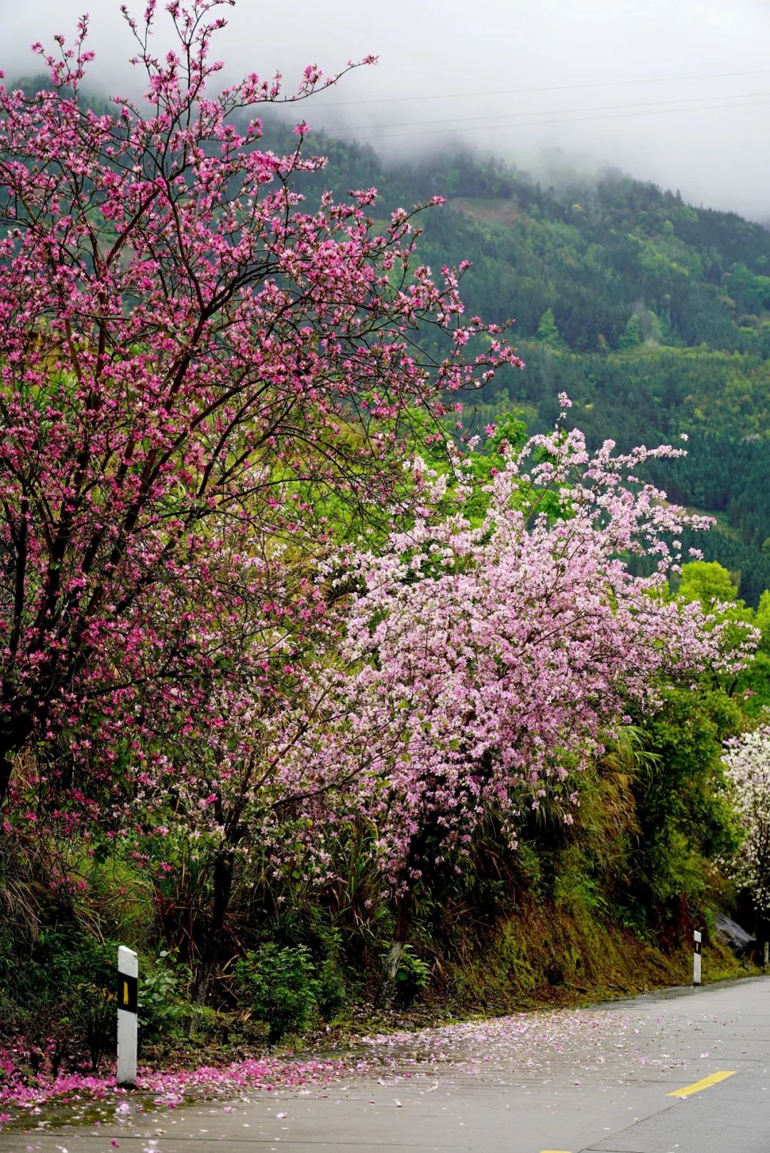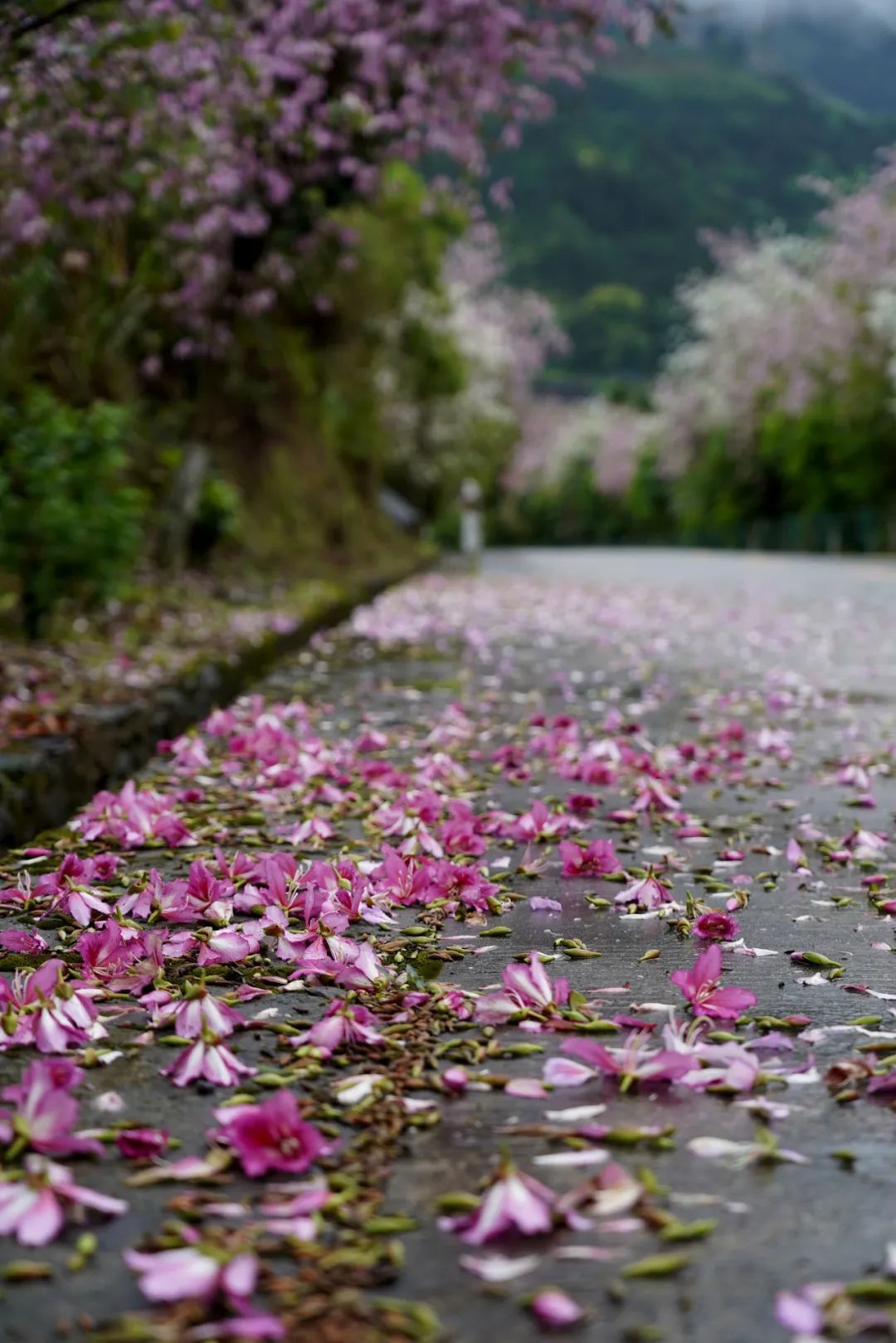 远远望去,那紫红的花瓣一层又一层地覆盖在道路上,