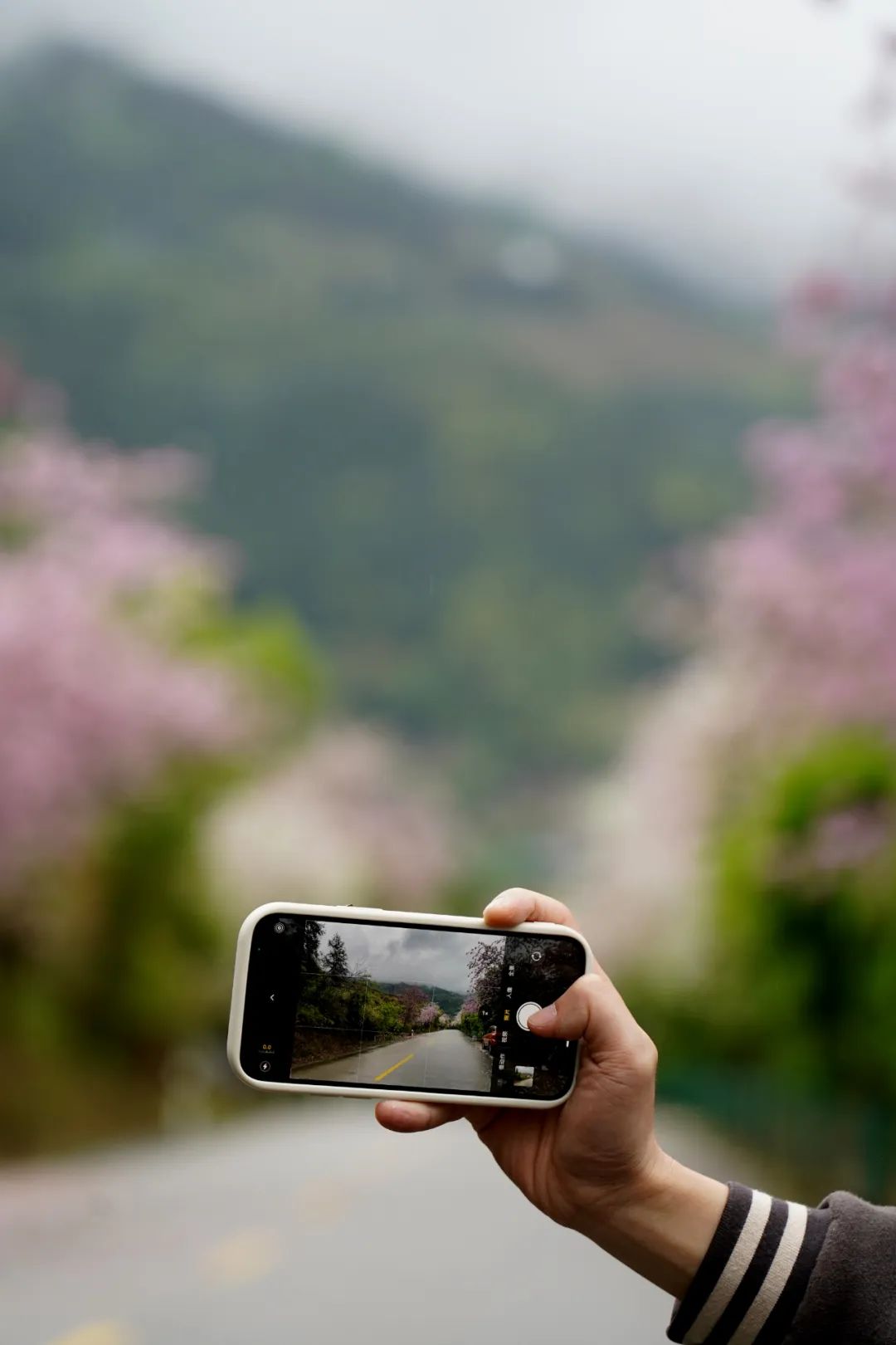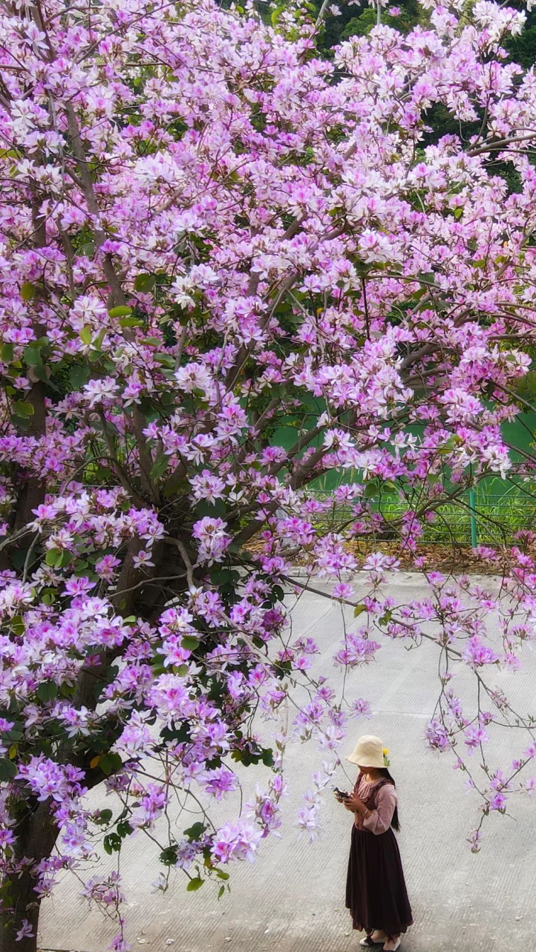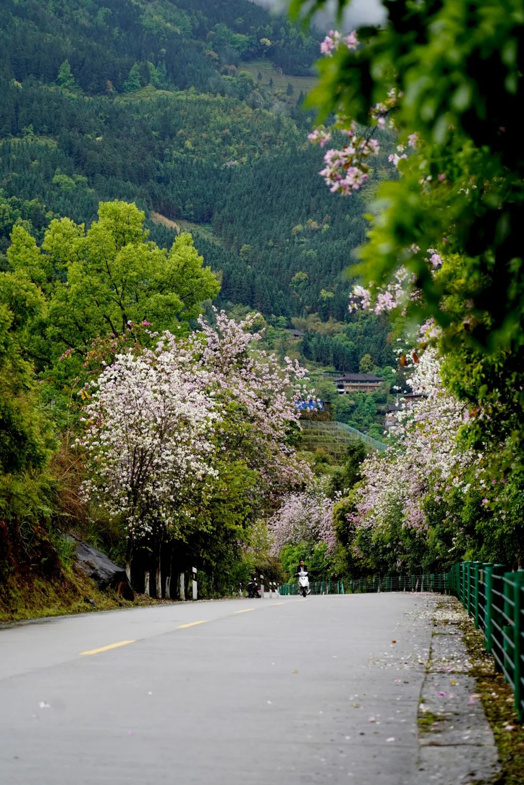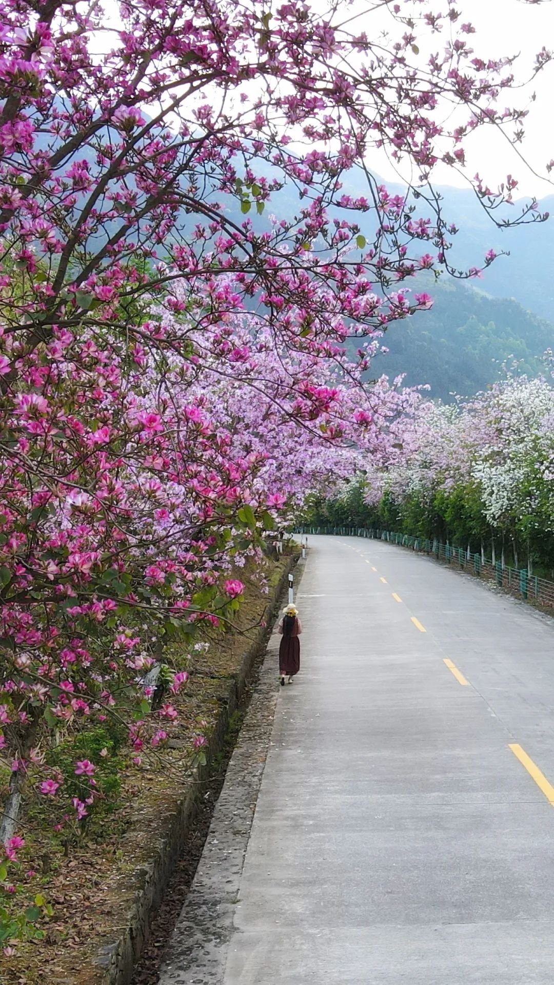 远远望去,那紫红的花瓣一层又一层地覆盖在道路上,