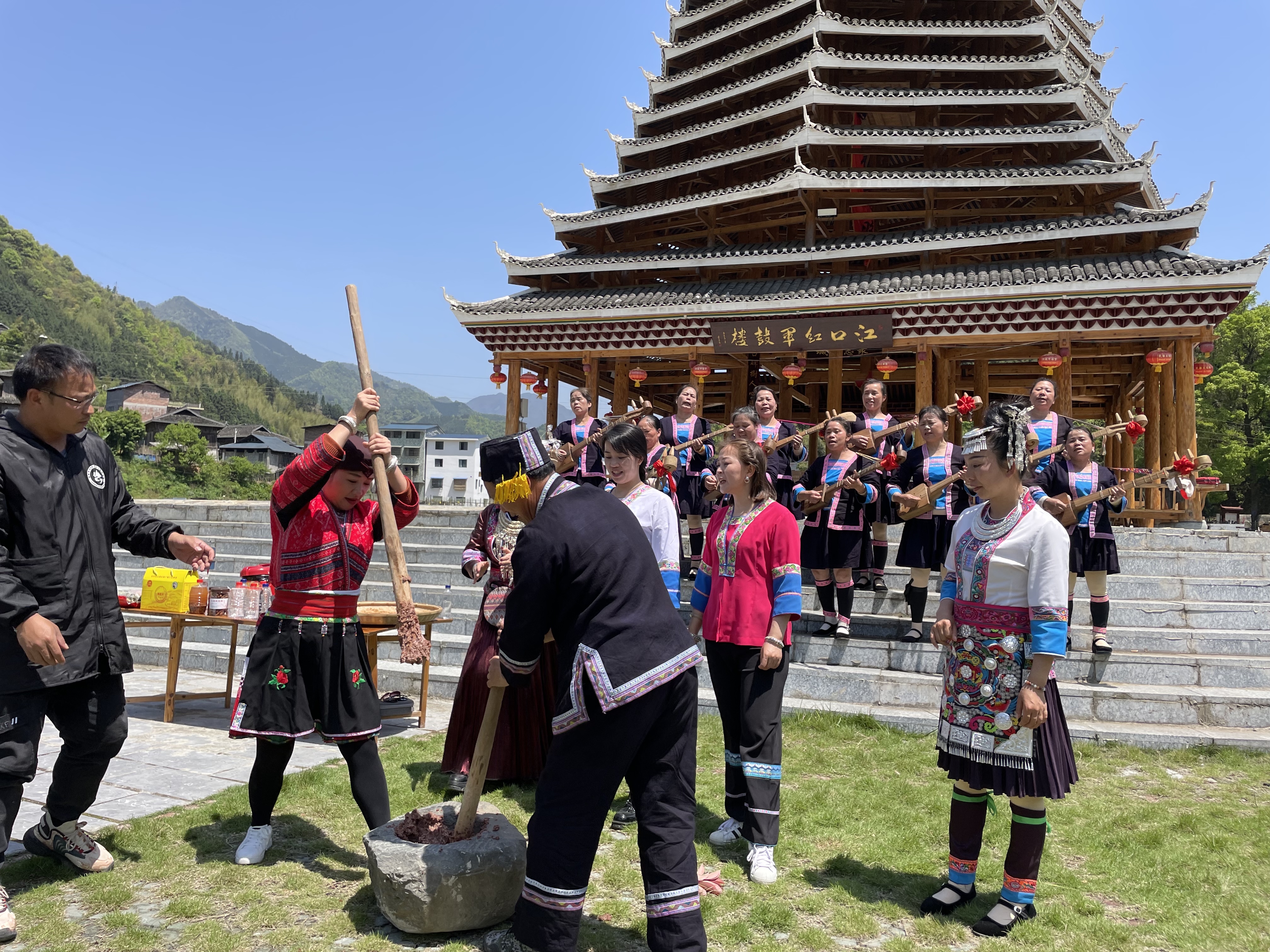 直播带货现场,当地的侗族群众弹起“欢迎你到侗寨来”琵琶歌,欢迎关注龙胜特色农产品及江口侗寨的网友们,现场还将蒸起的红糯米,倒入洗干净的石槽内,为网民们表演打糍粑,精彩的表演把直播的气氛推向高潮。