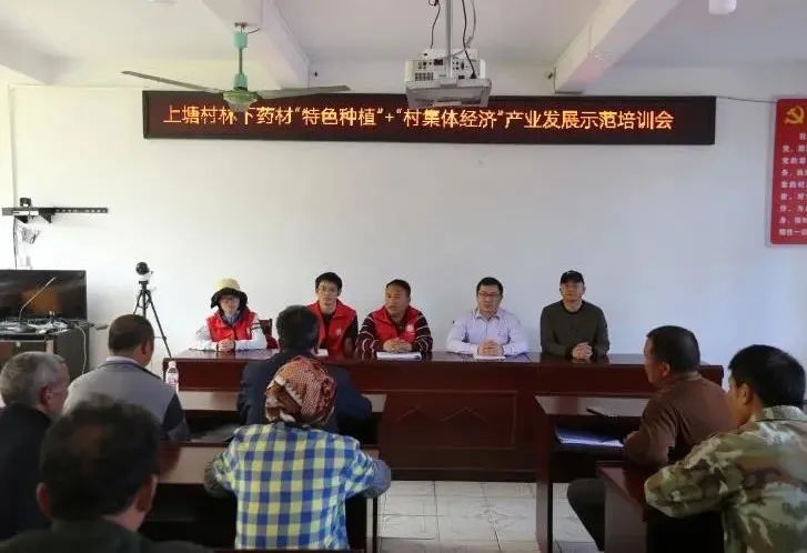 专家帮带“传经送宝”,激发产业内生动力。上塘村党支部坚持人才引领发展战略,为培养有文化、懂技术、会经营的种植骨干,以后援单位先进技术和理念为支持,探索“党建引领+技术服务”模式,成立“示范点红马甲”党员先锋队,开办以专家为老师和班主任,第一书记、村党支部书记为班长,示范点种植骨干为学习委员的村级林下药食两用经济作物生态种植技术示范培训班。培训班定期邀请专家到村开展理论讲座和现场教学,让农户了解高产技术和病虫害防治技术,目前已组织培训2次,累计培训60余人,解决群众生产技术难题20余个;“示范点红马甲”党员先锋队与种植户结对帮扶,提供送种苗、送农资、送政策、送服务、送爱民温情的“五送”服务,充分发挥党支部战斗堡垒和党员先锋模范作用,为上塘村发展林下药材种植,促进农户增收致富提供强有力的后盾保障。