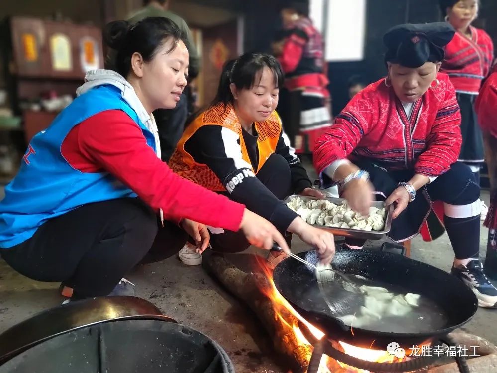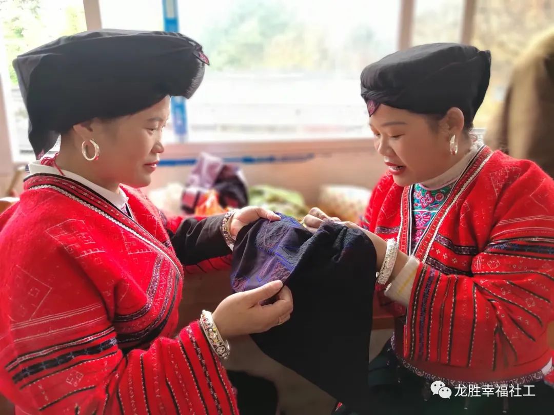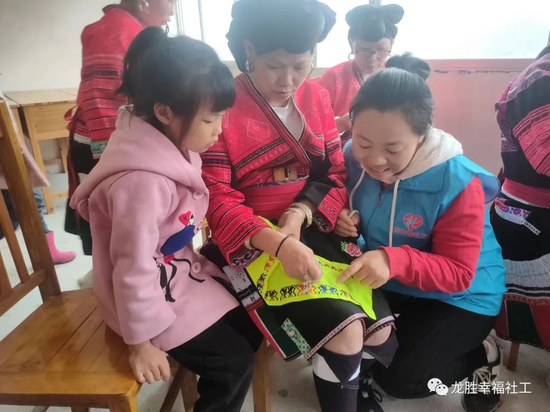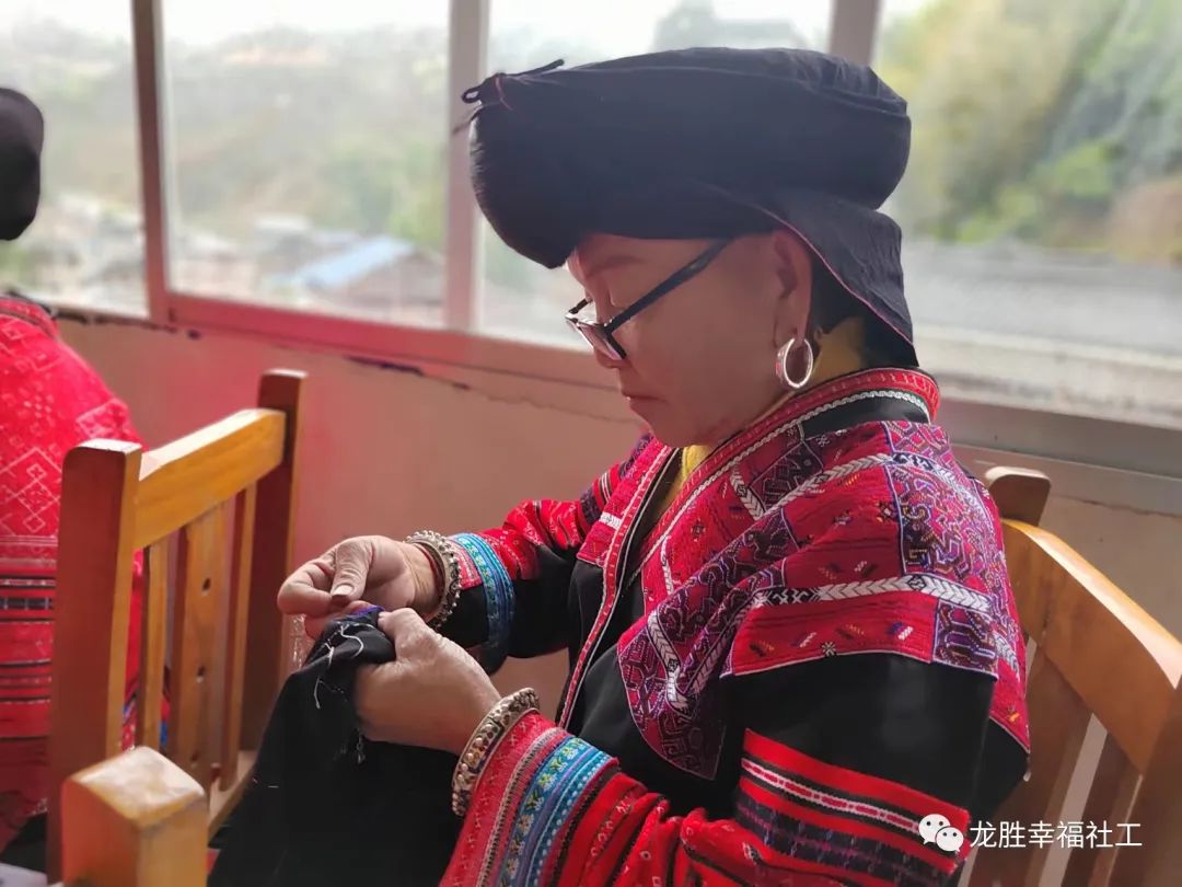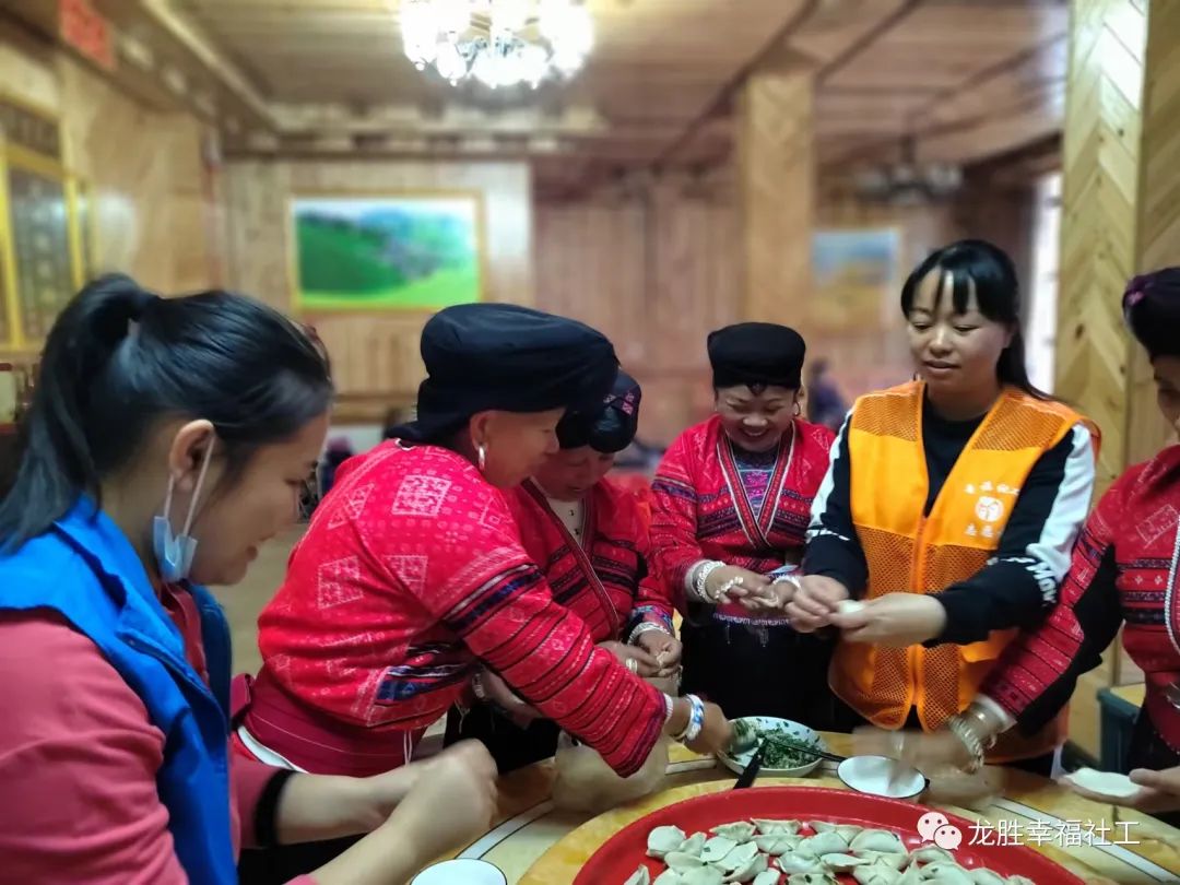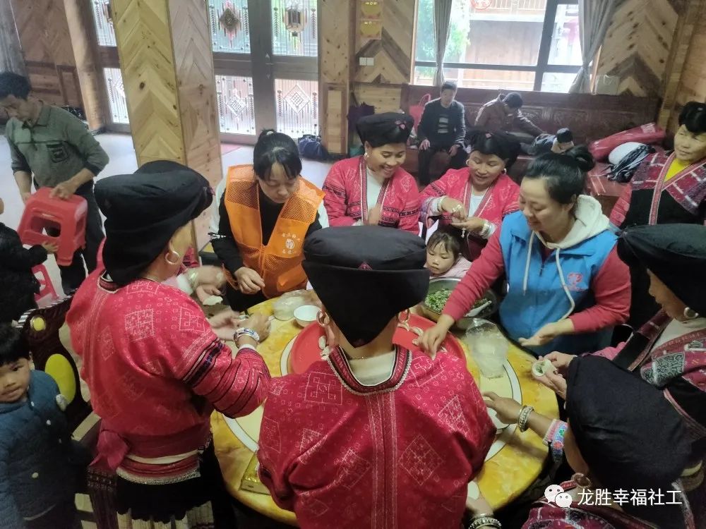 整个活动绣场上,阿奶们带着老花镜穿针纳线,动作娴熟,阿嫂们相互交流、切磋,虚心请教,儿童们走来窜去时不时比比谁的鸟儿绣得更好、谁的鱼儿绣得更灵动,有的帮奶奶捋一捋丝线,有的坐上妈妈的织布机感受感受编织腰带。绣手们都憋着一股劲,都想比试比试谁绣得又快又好。快乐的时光总是过得很快,快到中午了,大家一起包饺子,吃团圆饭,你摘菜,我剁馅,包饺子的时候大家自发地唱起了红瑶山歌“一梳长发黑又亮,梳妆打扮为情郎。二梳长发浓又亮,夫妻恩爱情义长。丝丝长发长又亮,父母恩情永不忘。乌龙盘发亮堂堂,幸福生活久久长,幸福生活久久长。”等等,山歌唱出感谢共产党给了瑶族同胞的幸福生活,感谢社工给了活动机会,还有热情好客的瑶族敬酒歌,社工都醉在了歌海中,活动在开心快乐中结束。