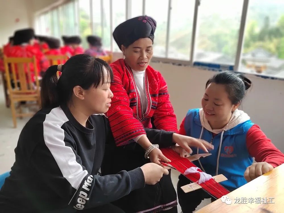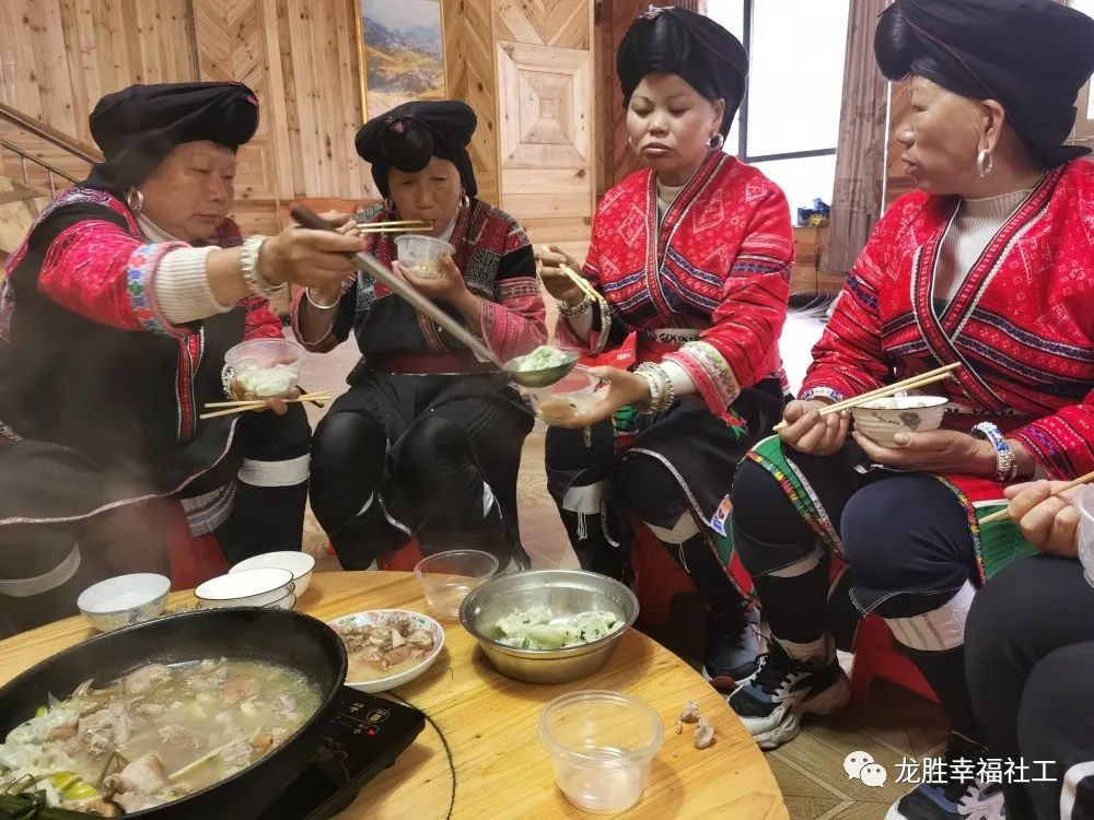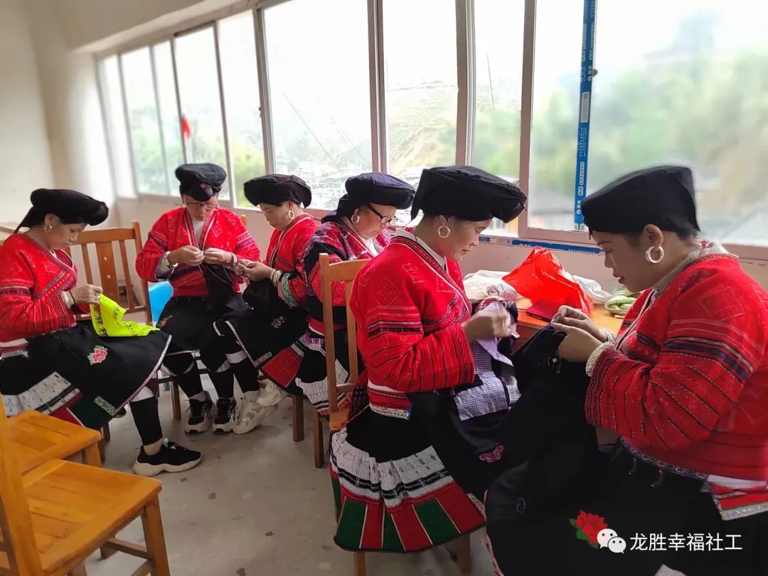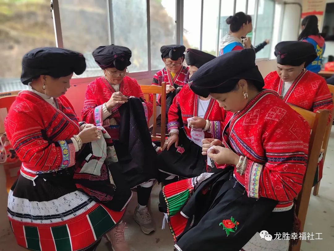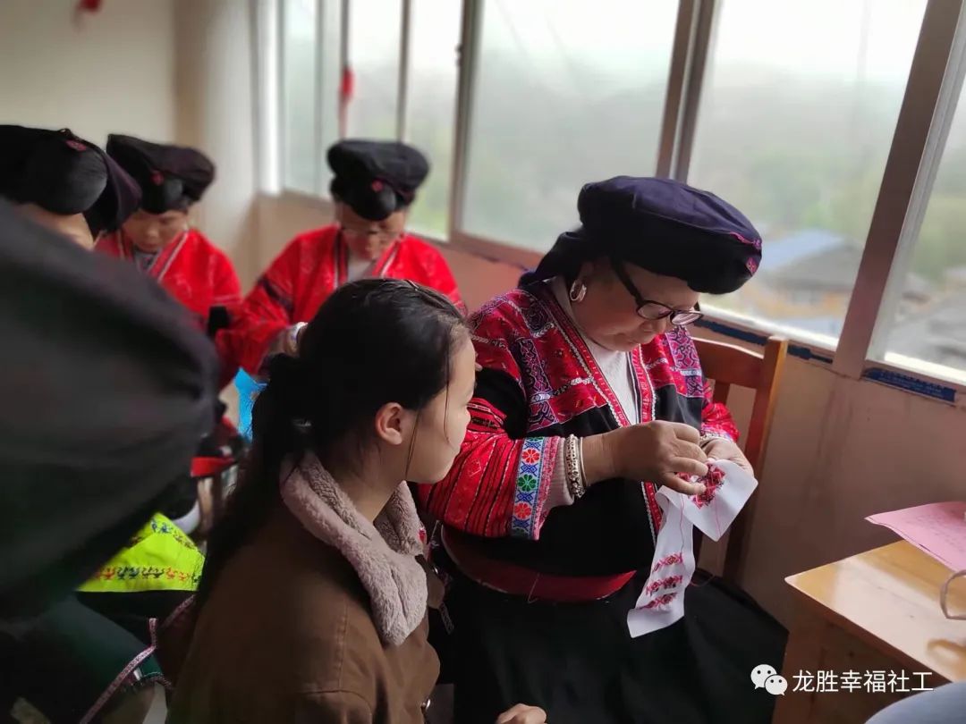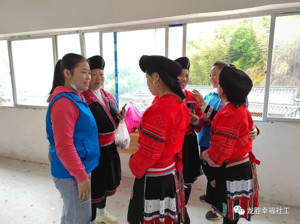 整个活动绣场上,阿奶们带着老花镜穿针纳线,动作娴熟,阿嫂们相互交流、切磋,虚心请教,儿童们走来窜去时不时比比谁的鸟儿绣得更好、谁的鱼儿绣得更灵动,有的帮奶奶捋一捋丝线,有的坐上妈妈的织布机感受感受编织腰带。绣手们都憋着一股劲,都想比试比试谁绣得又快又好。快乐的时光总是过得很快,快到中午了,大家一起包饺子,吃团圆饭,你摘菜,我剁馅,包饺子的时候大家自发地唱起了红瑶山歌“一梳长发黑又亮,梳妆打扮为情郎。二梳长发浓又亮,夫妻恩爱情义长。丝丝长发长又亮,父母恩情永不忘。乌龙盘发亮堂堂,幸福生活久久长,幸福生活久久长。”等等,山歌唱出感谢共产党给了瑶族同胞的幸福生活,感谢社工给了活动机会,还有热情好客的瑶族敬酒歌,社工都醉在了歌海中,活动在开心快乐中结束。