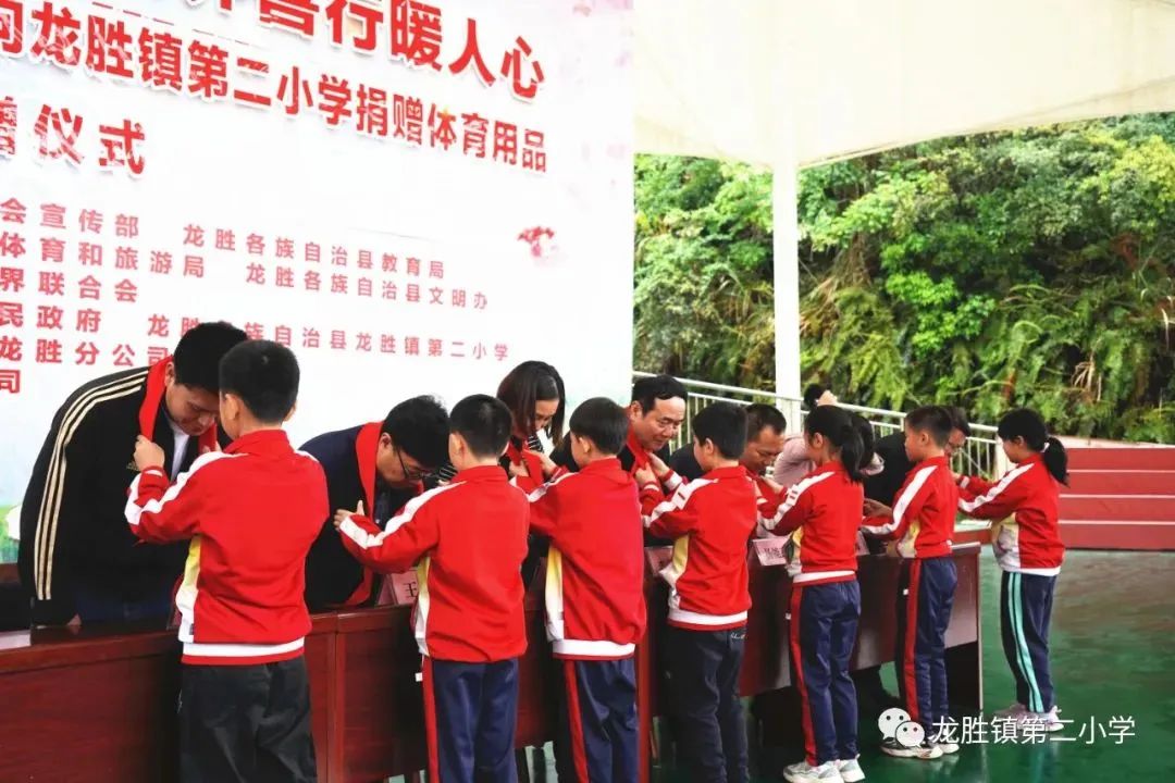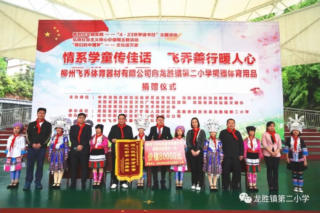 当天下午,在龙胜镇第二小学开放式体育馆里,举行了柳州飞乔体育器材有限公司向龙胜镇第二小学捐赠体育用品的捐赠仪式。捐赠仪式上,柳州飞乔体育器材有限公司向龙胜镇第二小学捐赠了价值八万元的体育用品。此次捐赠活动由我局与县委宣传部、县教育局等单位一同主办。