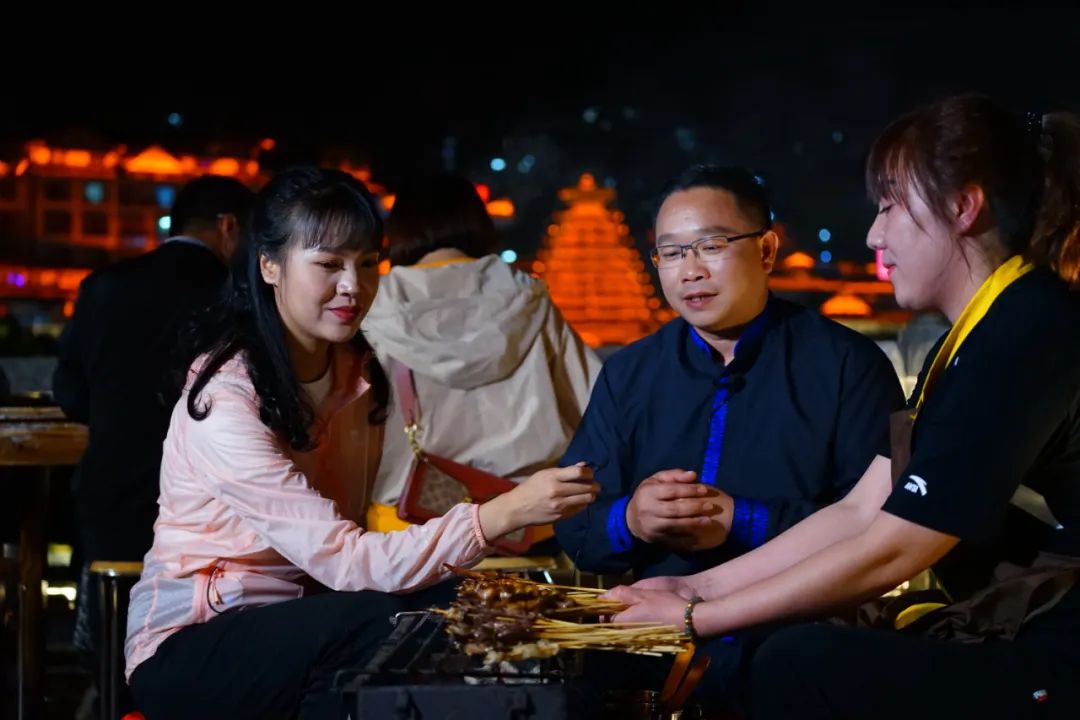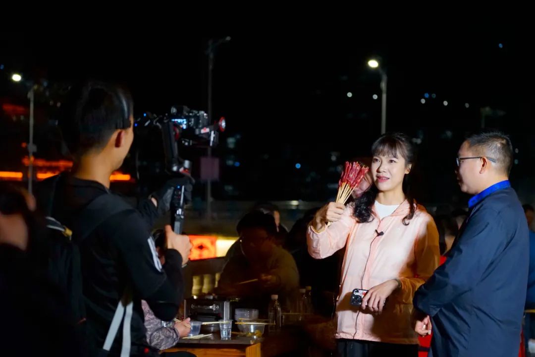 随着时间推移,镜头对准了临江美食街,龙胜原生态的美食也引发了观众的极大兴趣。龙胜风味的牛肉串、酸鸭、酸鱼、酸肉、烤鱼、烤韭菜、烤鸡尖等等应有尽有,烟火氤氲中,香气仿佛可以穿透屏幕,让观看直播的观众垂涎不已。