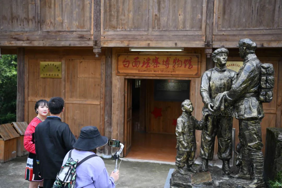 白面瑶寨主要以发展乡村旅游为主,同时种植罗汉果、枇杷等特色农作物,入围了“中国少数民族特色村寨”,民族文化丰富、底蕴深厚,同时还是泗水乡的红色教育基地之一。直播一开始,瑶家阿哥唱着山歌吹着唢呐迎接,在主播的带领下,镜头在荷塘、花田间游走,将原生态美景齐齐揽入画面。随后,主播向广大网友介绍了白面瑶寨的红瑶博物馆,在博物馆中,保存着一些当年红军长征过龙胜的珍贵照片和珍贵文物,让网友们一起感受当年的峥嵘岁月。