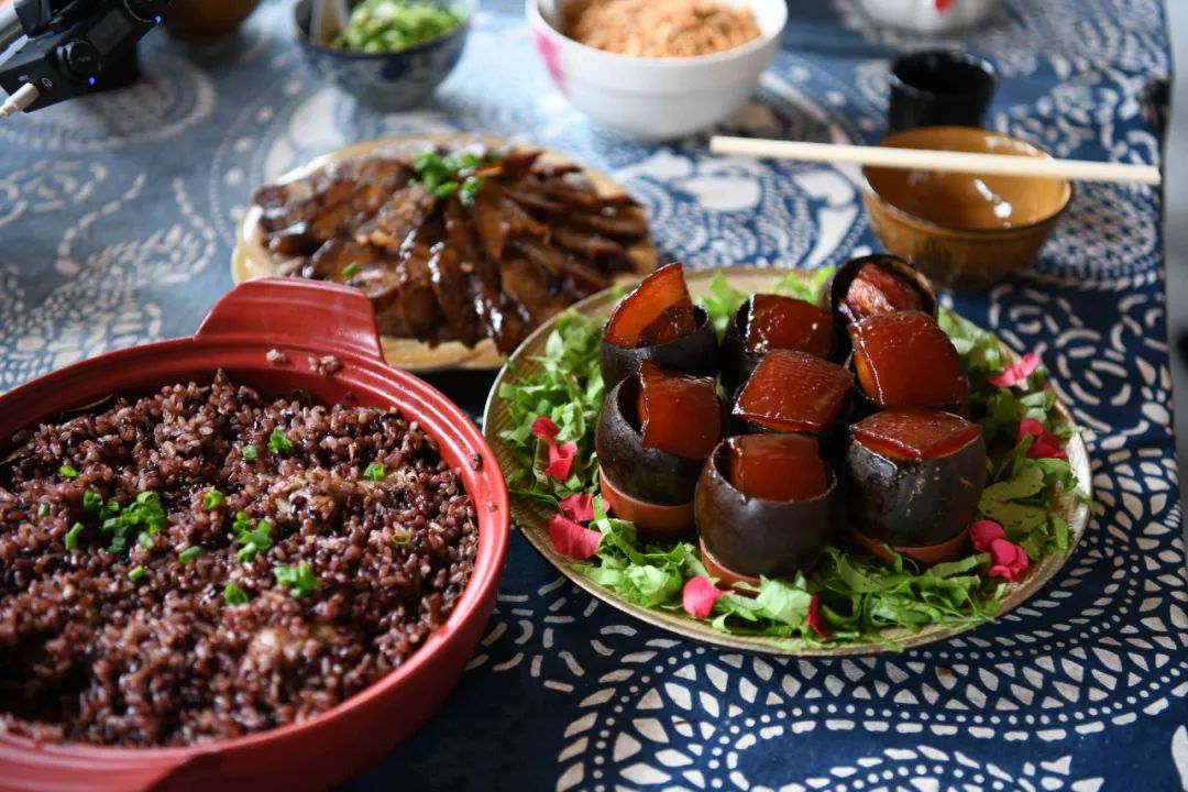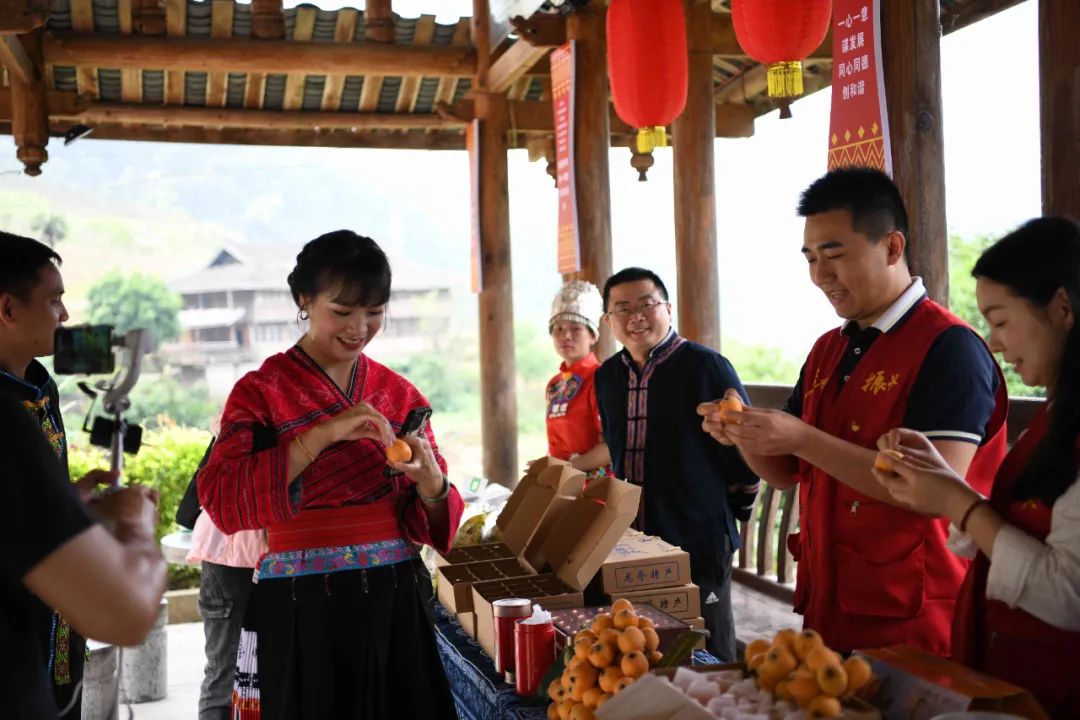 直播活动也向网友们展示了茶油、茶叶、罗汉果等特色农产品,展台上还有堆成小山的枇杷,黄橙橙的枇杷不仅色泽好,吃起来的口感也好,甜美多汁。通过枇杷产业带动了旅游的发展,用生态旅游将村民的心找在一起,守住了绿水青山,实现了生态致富。镜头扭转,红瑶阿嫂们在展示服饰的刺绣技艺,瑶族妇女个个心灵手巧,在镜头前看她们绣得细致认真。随着竹竿舞、长鼓舞等特色民俗活动的开始,将本场直播推向高潮。瑶族阿妹们在有节奏、有规律的竹竿碰击声里,敏捷地进退跳跃,我们的主播带领大家感受到了红瑶群众的热情好客,直播间的观众们也直呼要亲自来体验。龙胜米汤凤鸡茶、桂花蜜豆腐、老坛青瓜丝、芋香拼腊味、荷叶糯香骨,一道道让人口水直流。通过直播让大家如痴如醉地沉浸在美丽瑶乡。