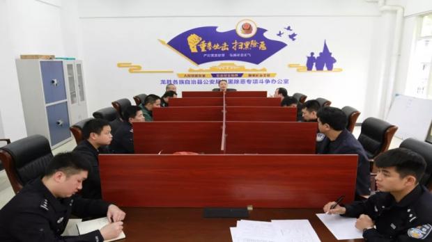为深入贯彻落实党的十九大部署和习近平总书记重要指示精神,保障人民安居乐业、社会安定有序、国家长治久安,创建平安和谐龙胜,全力推进全县扫黑除恶专项斗争工作,龙胜公安周密部署,坚持“有黑扫黑、有恶除恶、有乱治乱”的原则,组织多警种在全县范围内开展统一清查行动,打击震慑黑恶势力犯罪,有效铲除黑恶势力滋生土壤,有效净化社会风气,提高人民群众安全感和满意度。