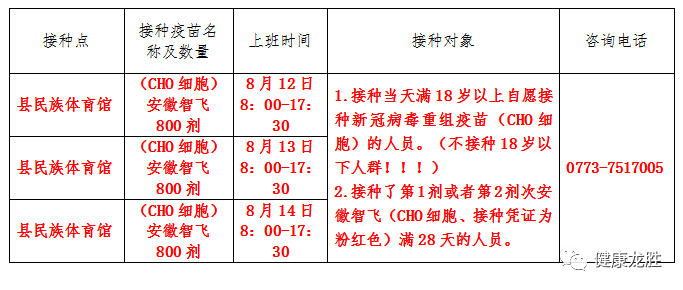 8月9日至8月15日,县民族体育馆接种点以安排需接种3剂的安徽智飞重组疫苗(CHO细胞)接种为主,第1、2、3剂都可以接种!!重组疫苗只能接种年满18周岁以上人群,未满18周岁人群不要前往接种!!