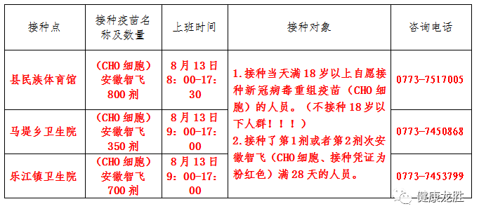 到期接种第2剂、第3剂次安徽智飞重组疫苗(CHO细胞)的群众,请携带前一次的接种凭证(纸质或电子版均可、也可出示健康绿码接种证明)和本人身份证,戴好口罩前往就近接种点接种。后续请关注“健康龙胜”微信公众号,及时了解疫苗接种安排。