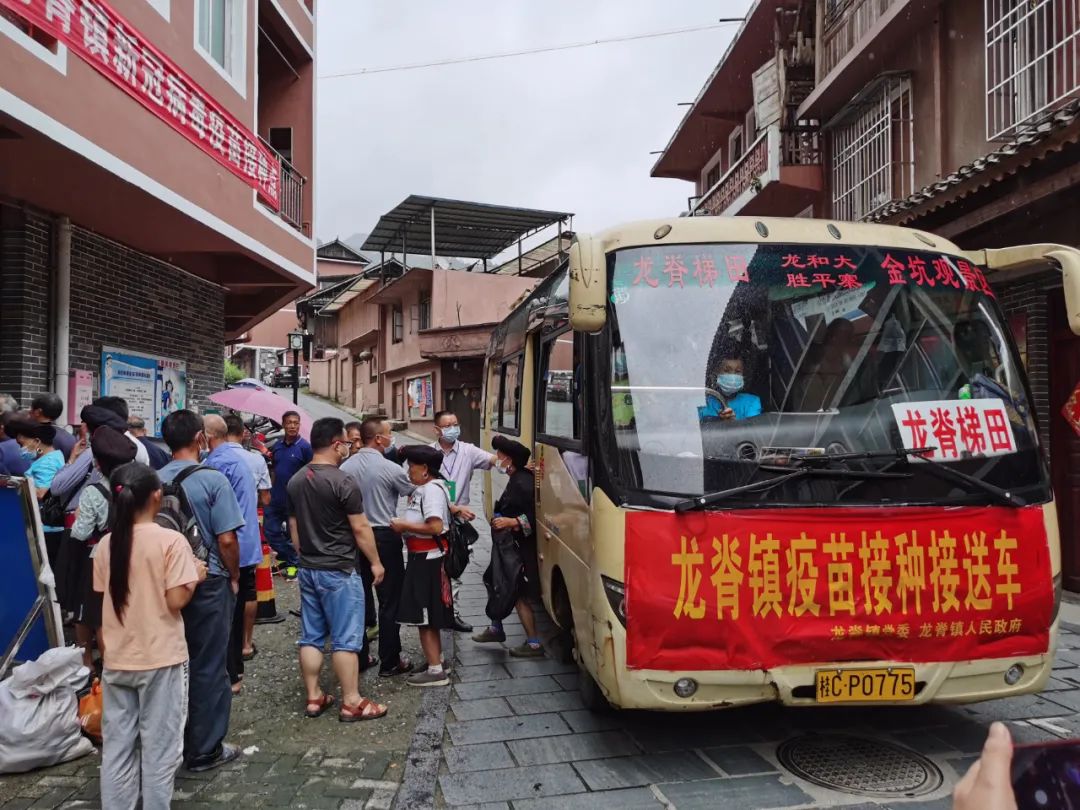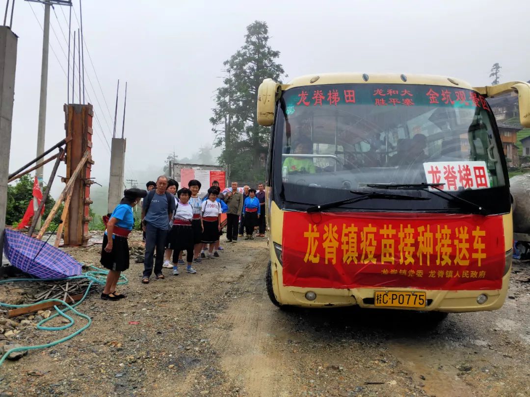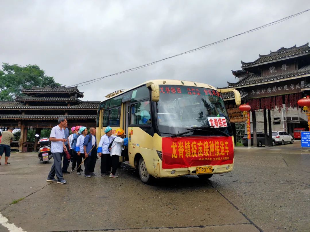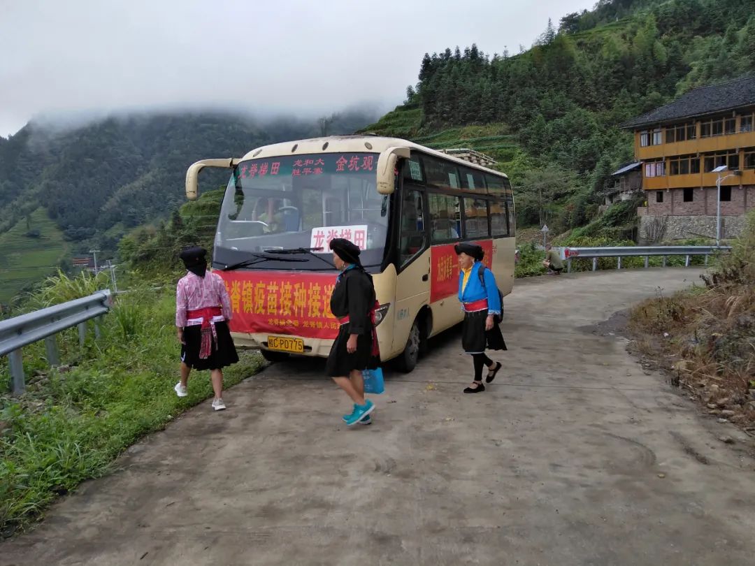 针对山区村庄离接种点较远,山区老人行动不便的情况,龙脊镇科学谋划,精心部署,派出了6辆“疫苗接种接送车”分别前往金江村、大寨村、中六村、小寨村、江柳村、平安村等6个行政村,统一接送辖区内未接种人员前往镇卫生院进行疫苗接种。镇、村干部挨家入户宣传动员,并作为领队组织群众定时定点集中候车,每辆专车都安排了镇政府工作人员跟车,到了卫生院,镇政府和卫生院的工作人员依次搀扶行动不便的群众下车、协助登记信息、告知接种流程、引导群众候场等。通过发挥乡镇、村党支部、志愿者作用,提供接送、绿色通道等服务,打通疫苗接种和为民办实事的“最后一公里”。