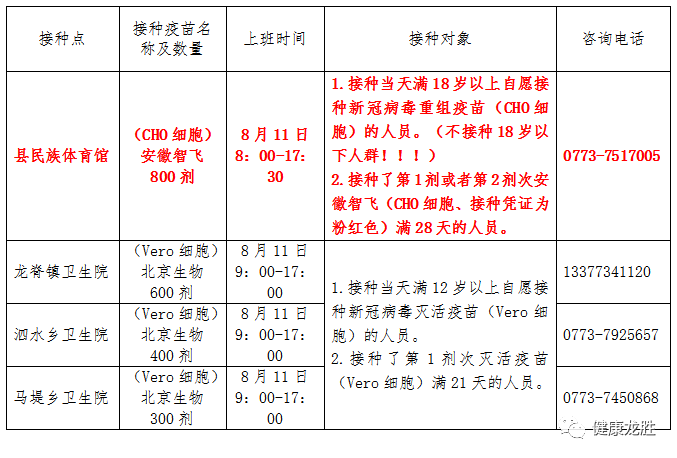 我县新到一批新冠疫苗,安排8月11日(星期三)在以下接种点进行接种,疫苗数量有限打完为止。
