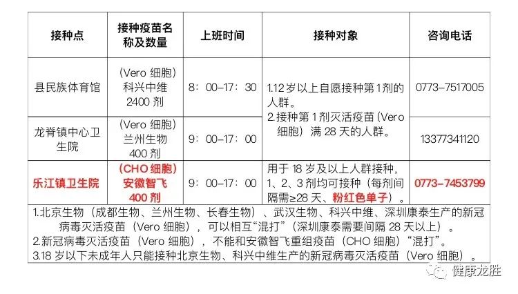 8月17日在县民族体育馆、龙脊镇、乐江镇开展新冠病毒疫苗接种,具体安排如下: