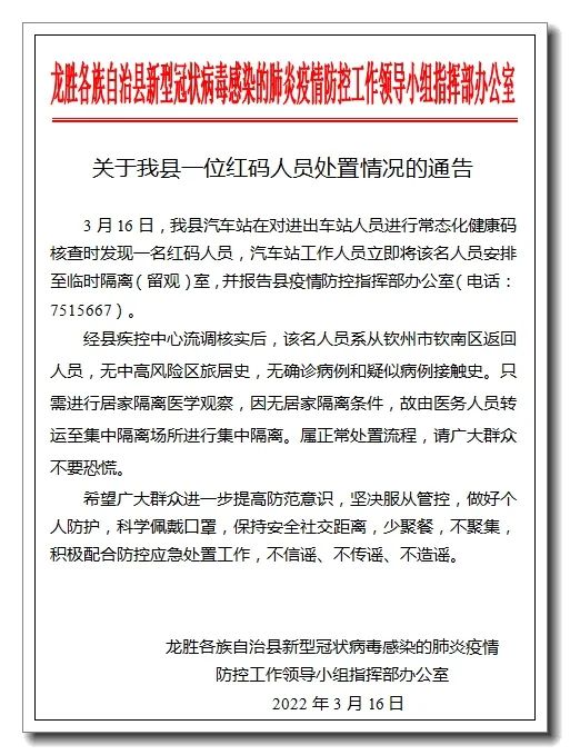 关于我县一位红码人员处置情况的通告