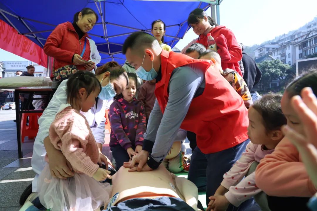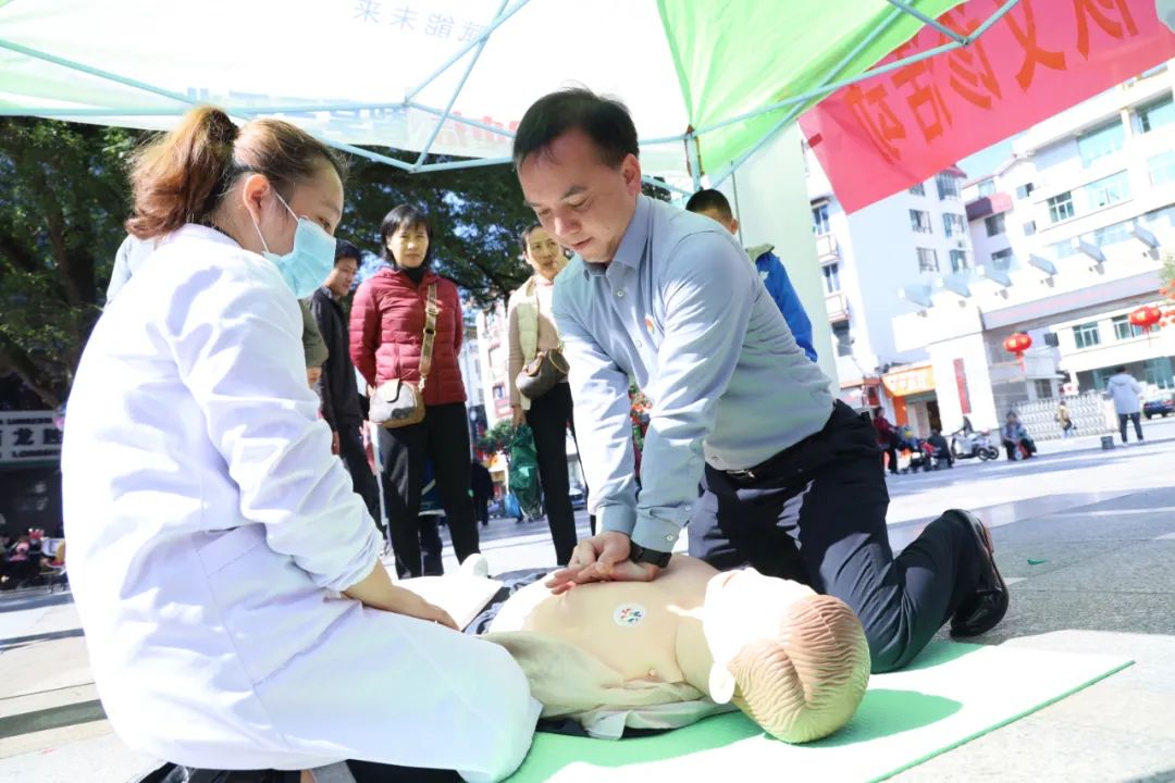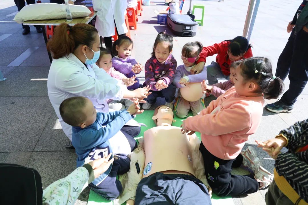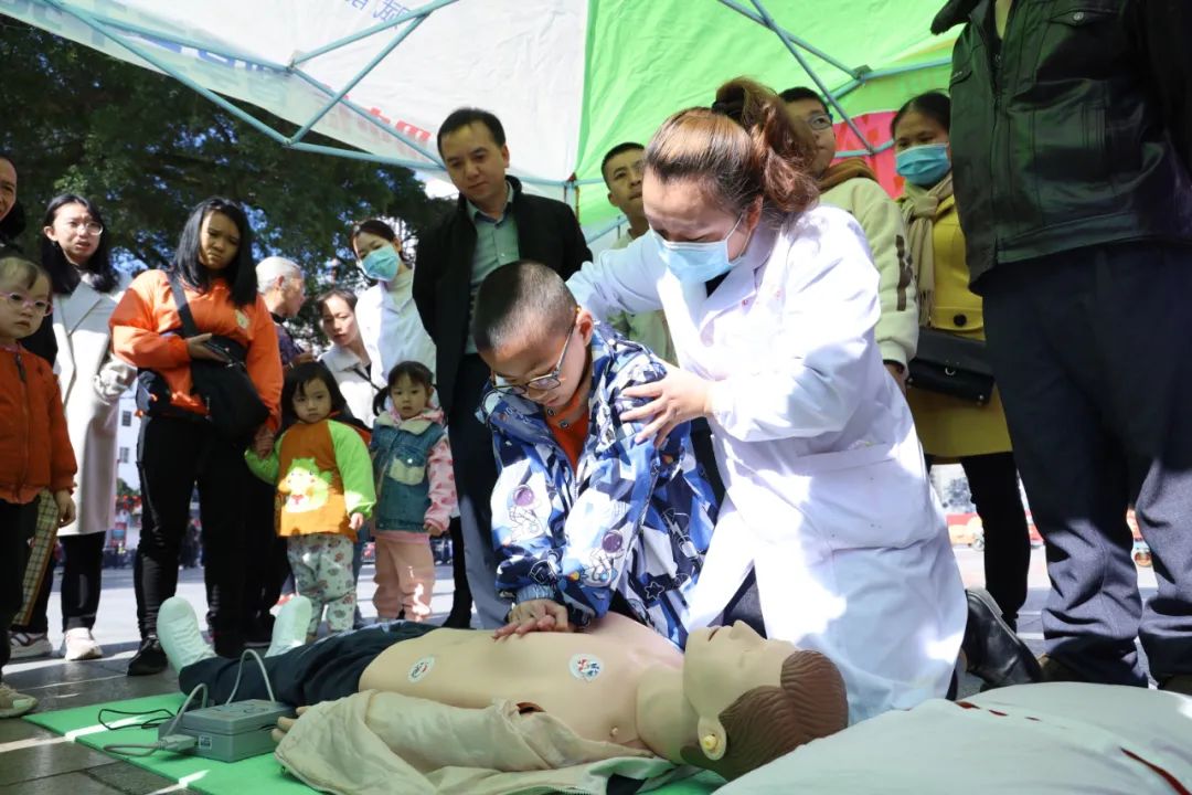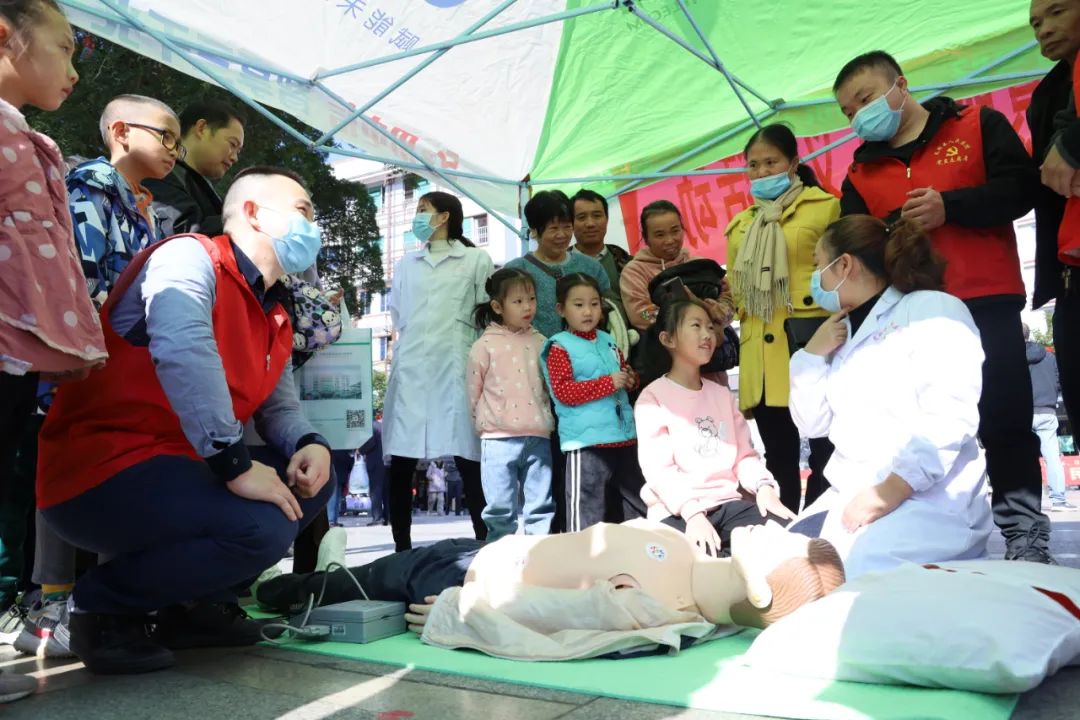 义诊现场,医疗专家凭借丰富的临床经验,耐心细致地为来访群众现场进行常见多发疾病的现场诊治,进行了针灸、耳穴治疗,宣传讲解各种常见病、多发病的预防知识和注意事项以及疾病的治疗,解答疑问,指导群众如何养成良好的生活习惯和饮食习惯,并针对不同病症和个体差异提出合理的诊疗建议和治疗方案,对部分病情较严重的患者,建议到医院检查、住院治疗。同时,为让群众更进一步了解急救常识和培养小朋友的急救意识,医务人员还现场讲解、演示心肺复苏操作,耐心讲解操作要点,手把手进行指导,并邀请现场群众和小朋友进行实际操作,让大家掌握更多的急救技能。专家们始终秉着严谨认真的态度,细心对待每一名前来咨询的群众,以实际行动践行全心全意为人民健康服务的崇高情怀,充分地体现医务工作者及党员志愿者们“守初心、担使命”一心为民的高尚情怀,短短半天时间共接待前来咨询、就诊群众260余人次,免费为群众测血压350余人次、血糖300余人次,急救培训50余人次,发放健康宣传册300余份。