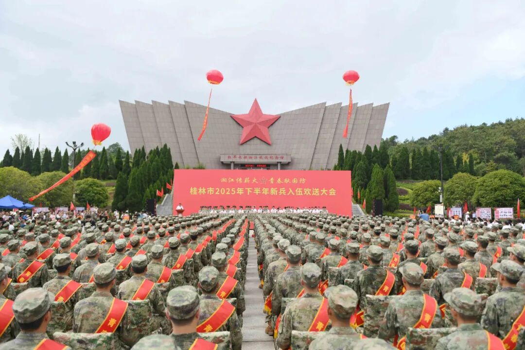 9月12日,桂林市2025年下半年新兵入伍欢送大会在全州红军长征湘江战役纪念园举行,全体新兵身着崭新军装、胸戴大红花,以最庄重的姿态在这片浸染革命热血的红色热土集结,接受精神洗礼,开启军旅新征程。广西军区朱元赛、谢锋,桂林警备区骆明忠;桂林市委常委、政法委书记蒋育亮,市人大常委会副主任杨玉霜,副市长、市公安局局长莫一格,市政协副主席谢永功等军地领导出席大会。自治县委副书记、县长蒙新宇,自治县人武部部长戴品龙参加大会。
