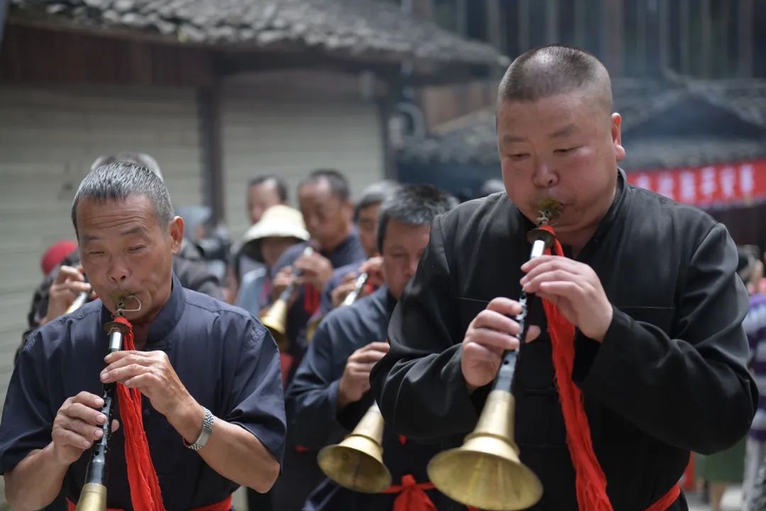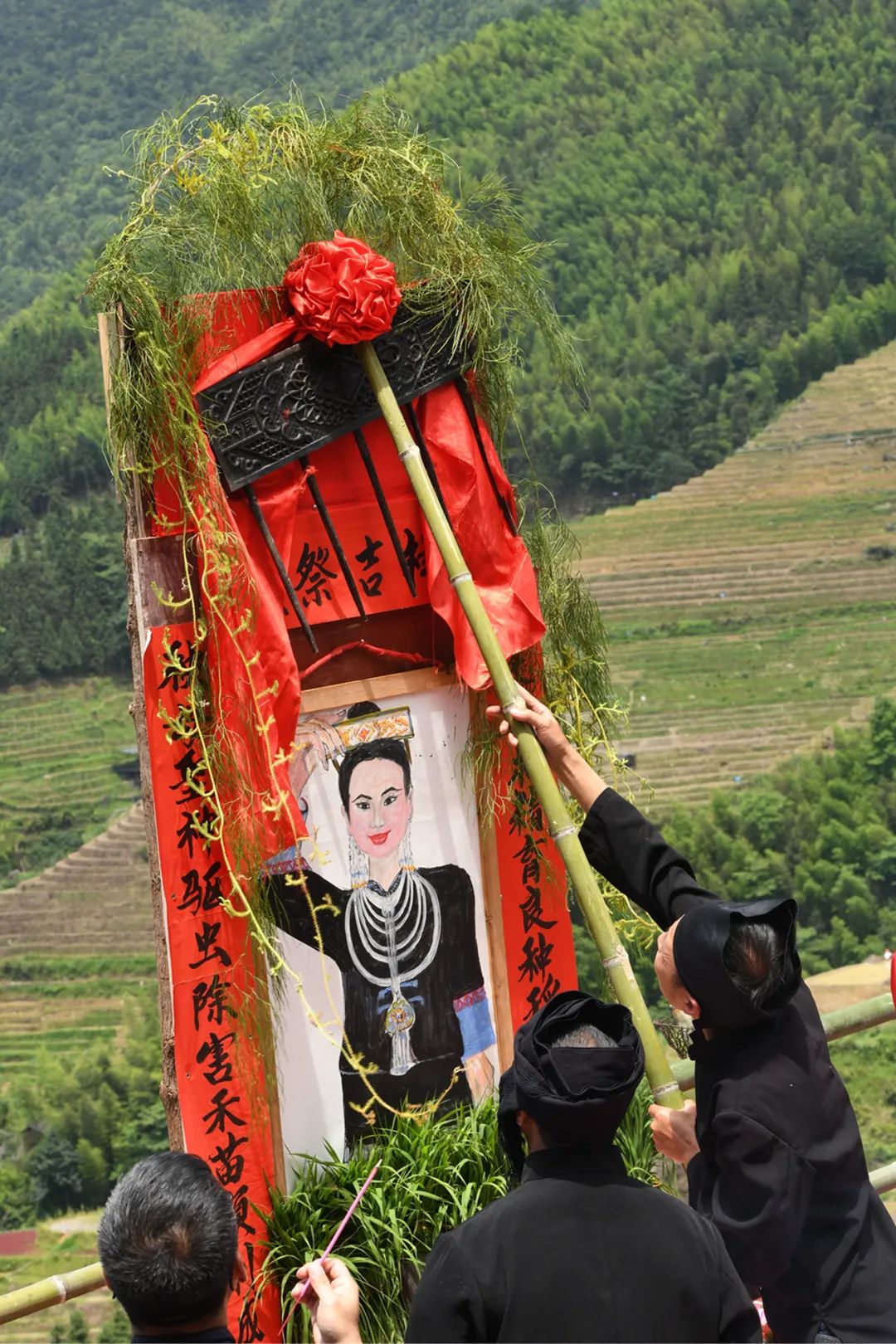 活动当天,村民们吹着唢呐,敲着锣鼓,舞起雄狮,姑娘和嫂子们手捧酒杯唱着欢快的敬酒歌,向远道而来的客人敬上一杯香甜的龙脊水酒。随后,平安壮寨村民们聚集在梯田“秧母田”田边,在寨佬和师公的带领下,在“秧母田”田边烧香,祭祀“秧母娘娘”。师公们鸣号、起鼓、祈福,在插秧之前向“秧母娘娘”上香并用秧母神梳,梳理秧苗抛入田中。雕花的秧梳相传是秧母娘娘留在人间的神物,用它梳理过的秧苗能茁壮成长,不长害虫,祈求秧母娘娘保佑全寨风调雨顺、五谷丰登。