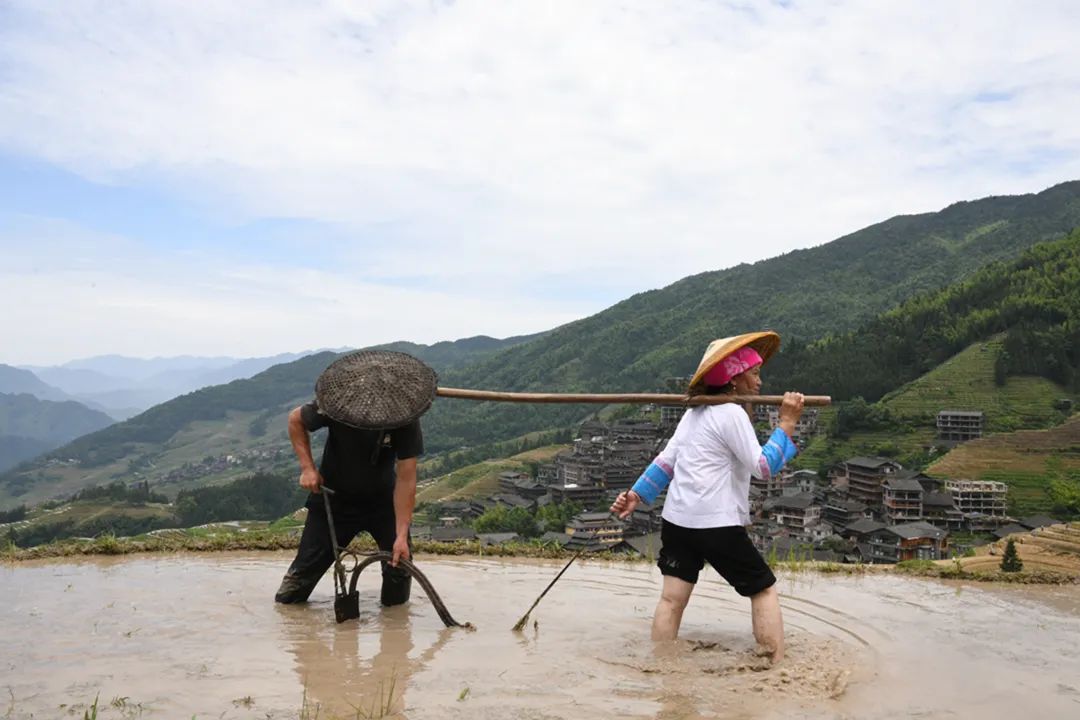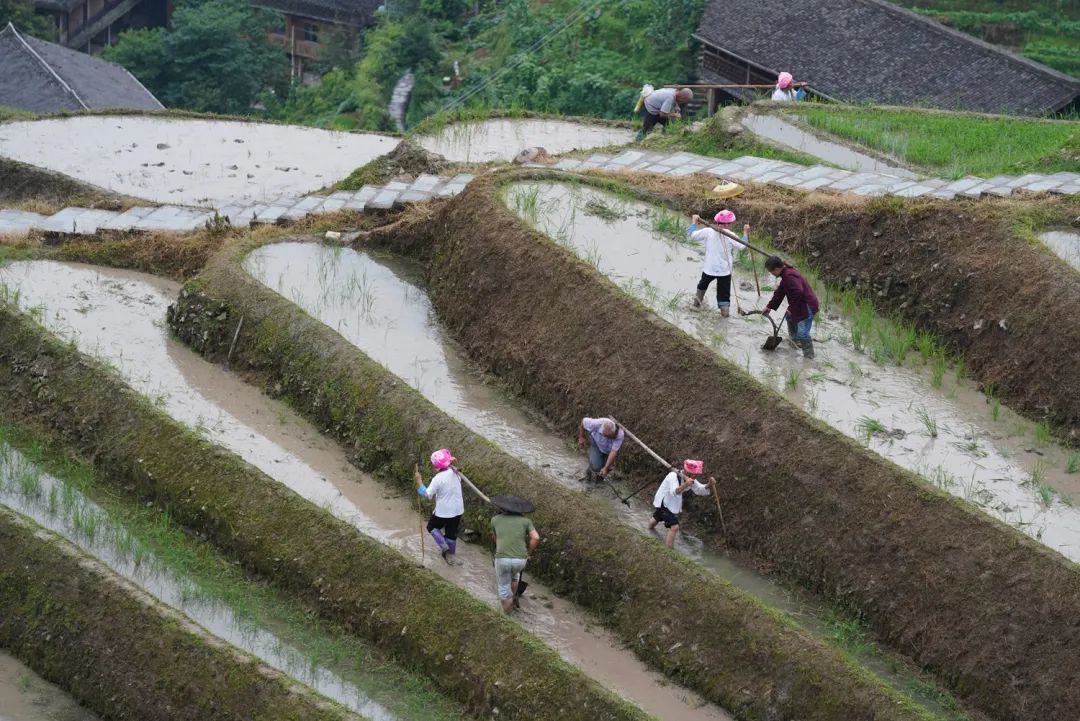 目前,龙脊梯田进入全面插秧季节,梯田水满泥润,当地农民在田间偶耕、梳秧、插田,吸引了大批游客和摄影爱好者。