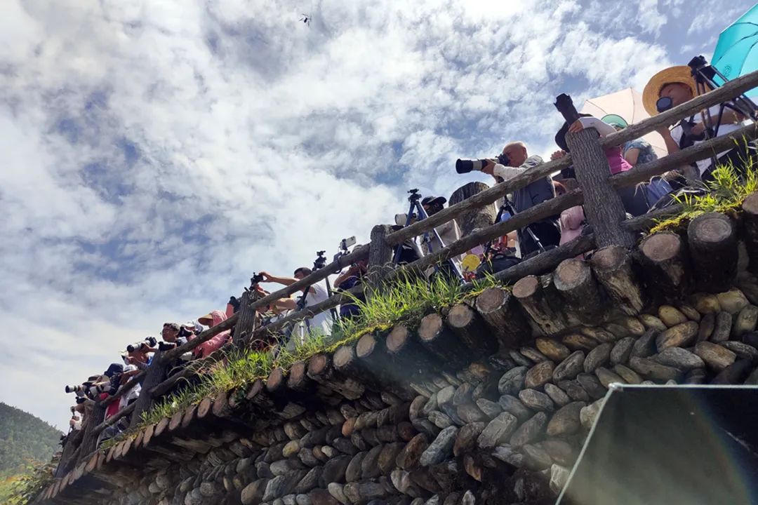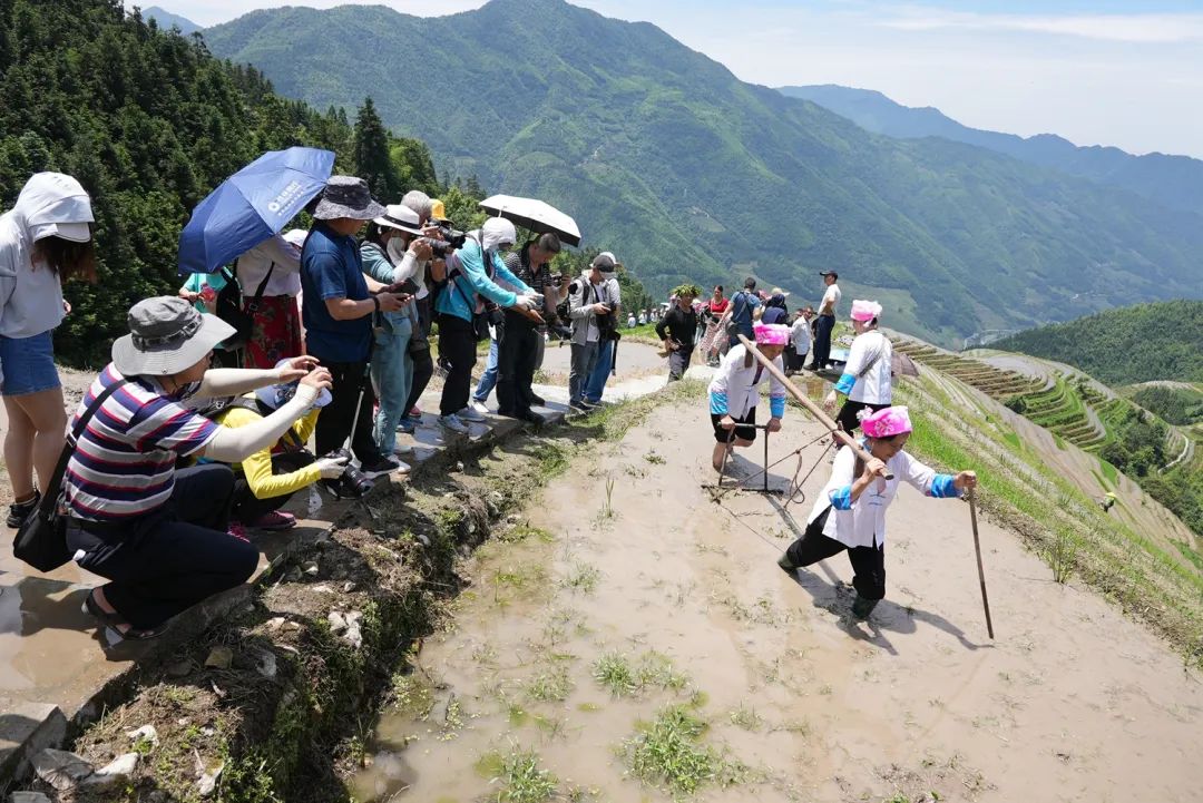 两声炮响,梯田里开始忙碌起来,偶耕、牛耕、梳秧、插秧,在“九龙五虎”上生动的展现出一幅立体的民俗风情画卷,演绎着大地的乐章。下午,村民还开展了生动有趣的插秧比赛、 梯田拔河比赛、抢凤鸡等传统的民俗活动。