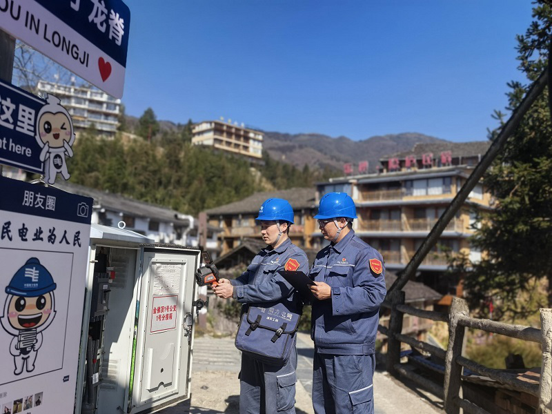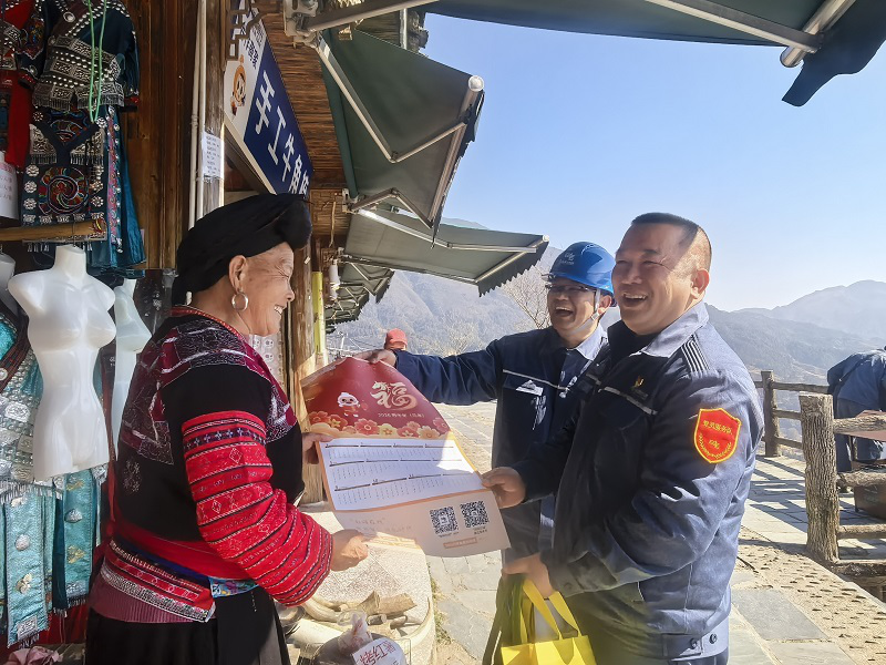 在龙脊大寨村,城区供电所党员服务队聚焦民宿客栈、旅游经营商户,开展专项安全用电检查。队员们严谨排查配电箱、大功率电器、应急电源等设备,精准捕捉负荷过载等潜在隐患,建立台账并现场指导整改。结合冬季高负荷用电特点,面对面讲解电气火灾预防、应急处置知识,发放宣传资料,同步送上新春挂历、年味小礼品,在传递节日祝福的同时,切实提升商户安全用电意识。“供电所上门排查隐患、送来问候,让我们心里踏实又温暖,能更安心迎接客流高峰。”龙胜揽星月酒店负责人王忠柳说道。