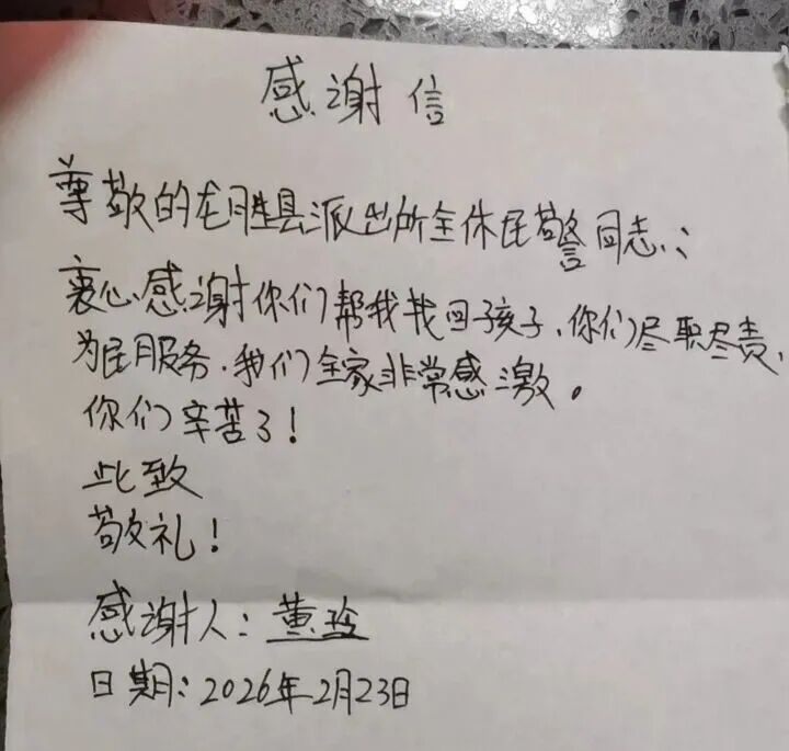 2 月 23 日下午,黄女士急匆匆冲进龙胜镇派出所,哭诉 6 岁儿子在滨江大道车站附近走失,值班民警刘文君一边暖心安抚焦急的母亲,一边快速核实孩子体貌特征,立即调取周边监控,在人流高峰中逐帧回放、细致排查。近一小时的专注坚守,民警终于锁定孩子行踪,火速赶往现场将孩子安全找回。见到安然无恙的孩子,黄女士激动落泪,紧紧握住民警的手连连道谢。