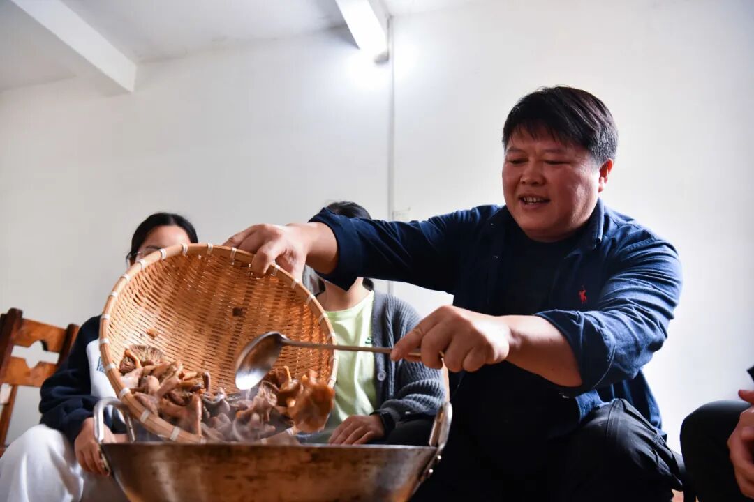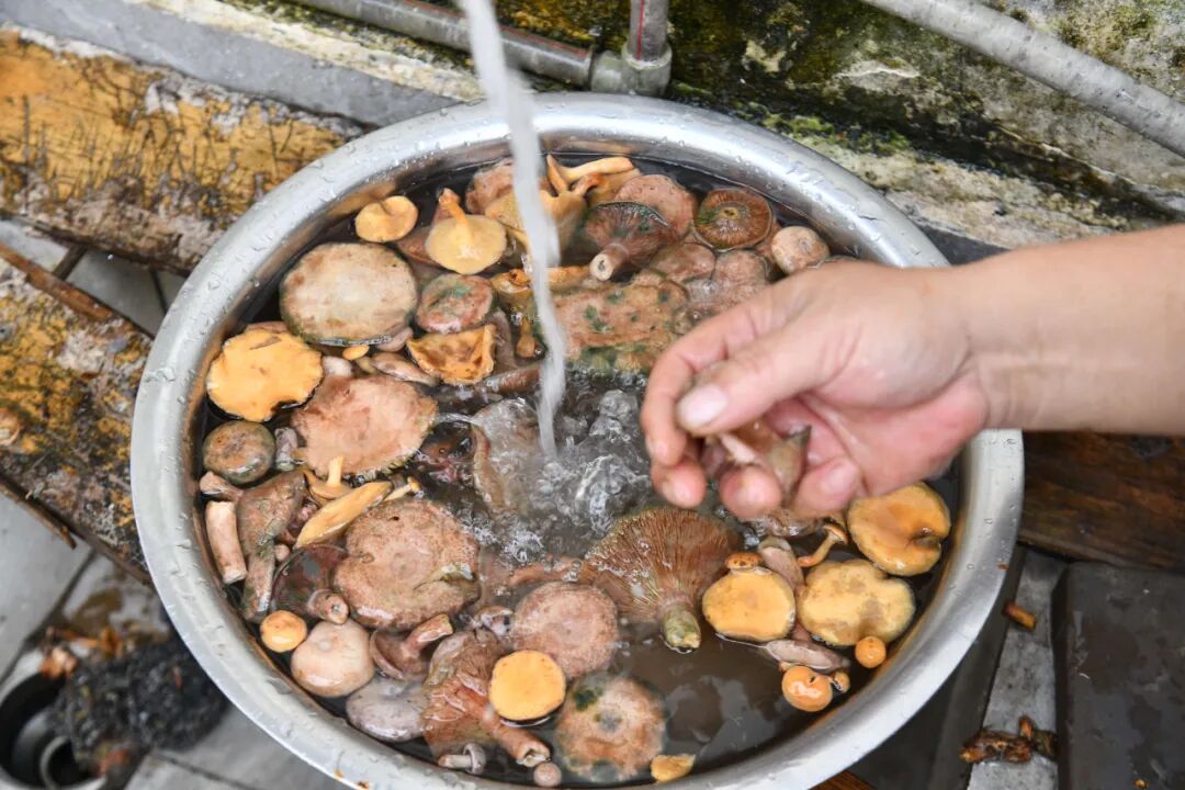 满载而归的村民们到家后,首要任务便是细致处理这份山珍。“找回家后就用清水洗,要相当仔细地洗。”侯吉华展示着清洗技巧,通过反复冲洗去除菌盖缝隙中的泥土和松针,保留其原生态的鲜香。谈及吃法,他更是如数家珍:“炖枞菌可以用鸡、五花肉、排骨、筒骨都可以炖,相当香甜可口。”无论是与本地土鸡同炖,汤色清亮香气扑鼻,还是搭配排骨慢煮,菌香融入肉汁,都是餐桌上最受欢迎的家常菜。