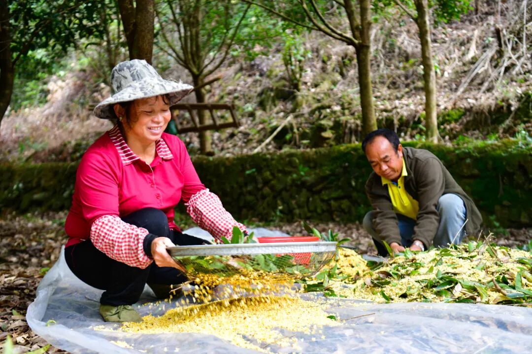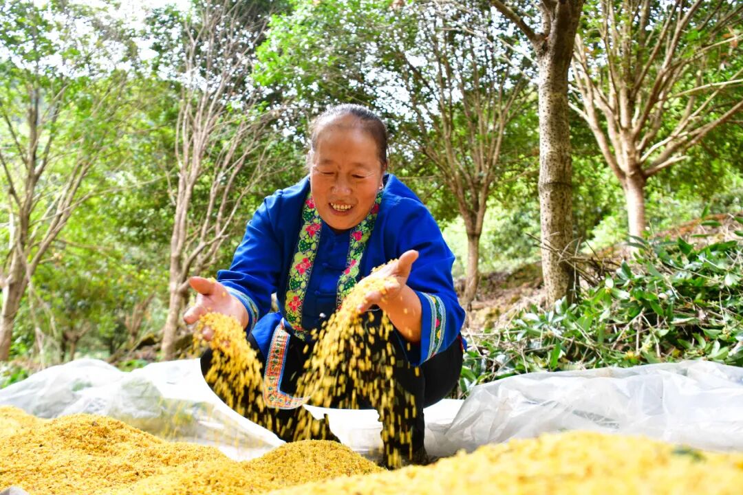 在龙脊镇大柳村的桂花林里金浪翻滚,香气氤氲。花农们正忙着采摘饱满的桂花,脸上满是丰收的喜悦。“这片桂花我种了20多年,近两年来年产稳定在2000斤左右,年收入能有一两万元。自从茶叶厂落地,咱们的桂花再也不愁卖,销路稳稳的!”大柳村花农肖美凤笑着说道。