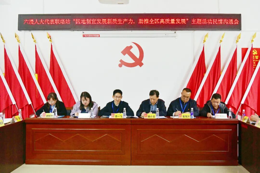 在民情沟通会上,与会人大代表集中学习新修改的代表法及有关文件政策,开展“人大代表讲述履职实践”活动,听取2024年度代表联络站民情沟通会建议办理情况并开展满意度测评,听取瓢里镇有关工作情况汇报。驻站人大代表和基层群众代表围绕“因地制宜发展新质生产力,助推全区高质量发展”积极发言,提出了“关于界泉村界口至小溪路段升级改造的建议”“关于瓢里镇公共照明基础设施提升的建议”等6条建议。自治县相关部门、瓢里镇作了现场解答或表态发言。会议还就《广西壮族自治区粮食安全保障条例(草案)》《桂林市政务服务规定(草案)》提出了修改意见,并讨论通过了2025年度代表联络站重点建议。