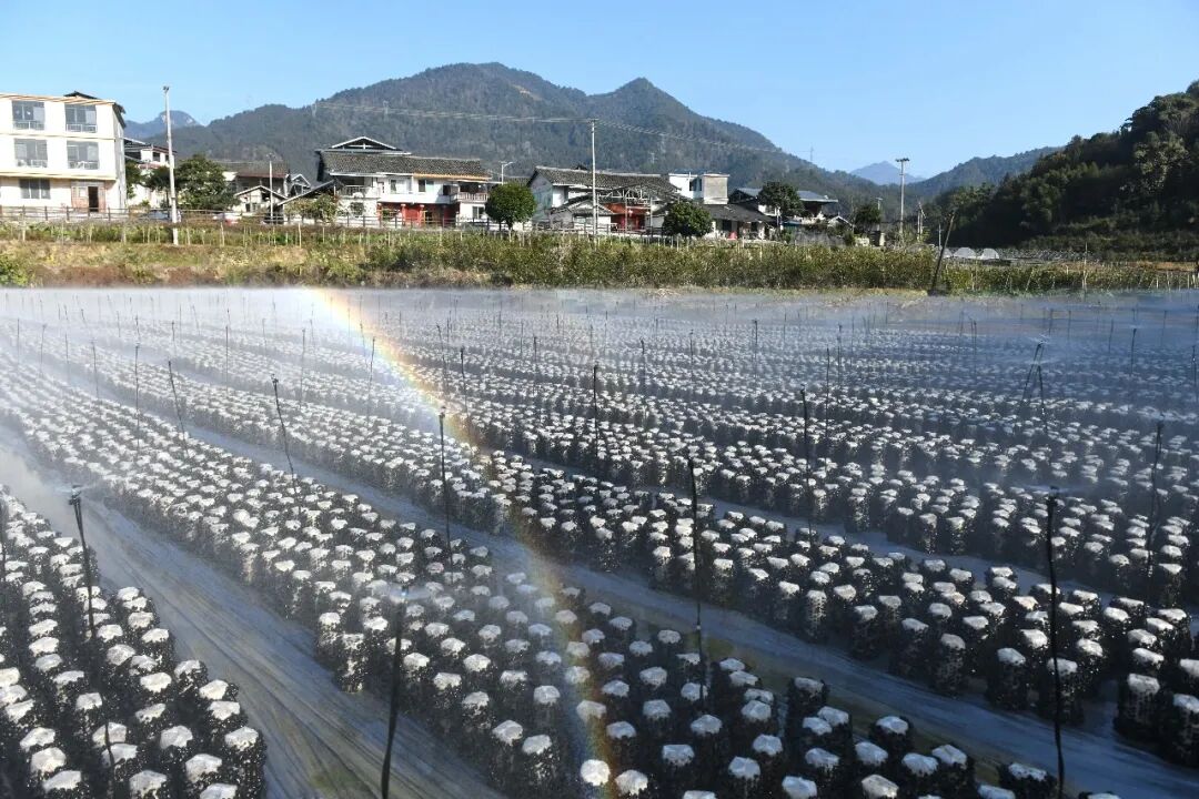 晴朗春日里,龙胜镇都坪村阳光和煦。在都坪村黑木耳种植示范基地,智能喷淋系统在阳光的映照下,划出一道道绚丽的彩虹,数十位村民正忙碌地采收木耳。