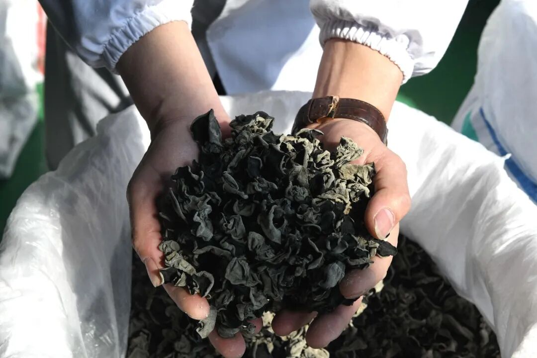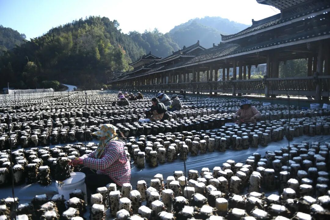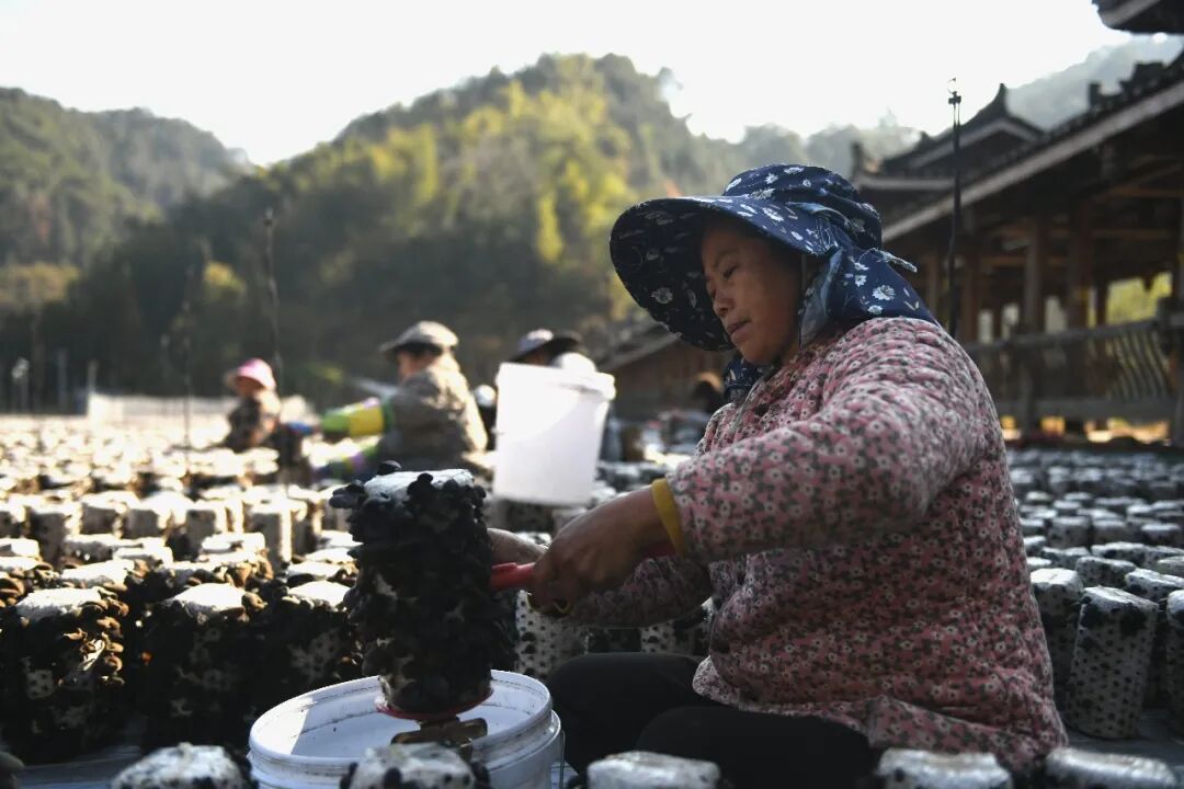 村民梁云芝头戴斗笠,指尖轻捻便将成熟的木耳摘下,簌簌落入塑料桶中:“我们老人家老了出去也不方便,在家门口务工,一天能挣些零花钱,还能照看好老小,日子有盼头!”