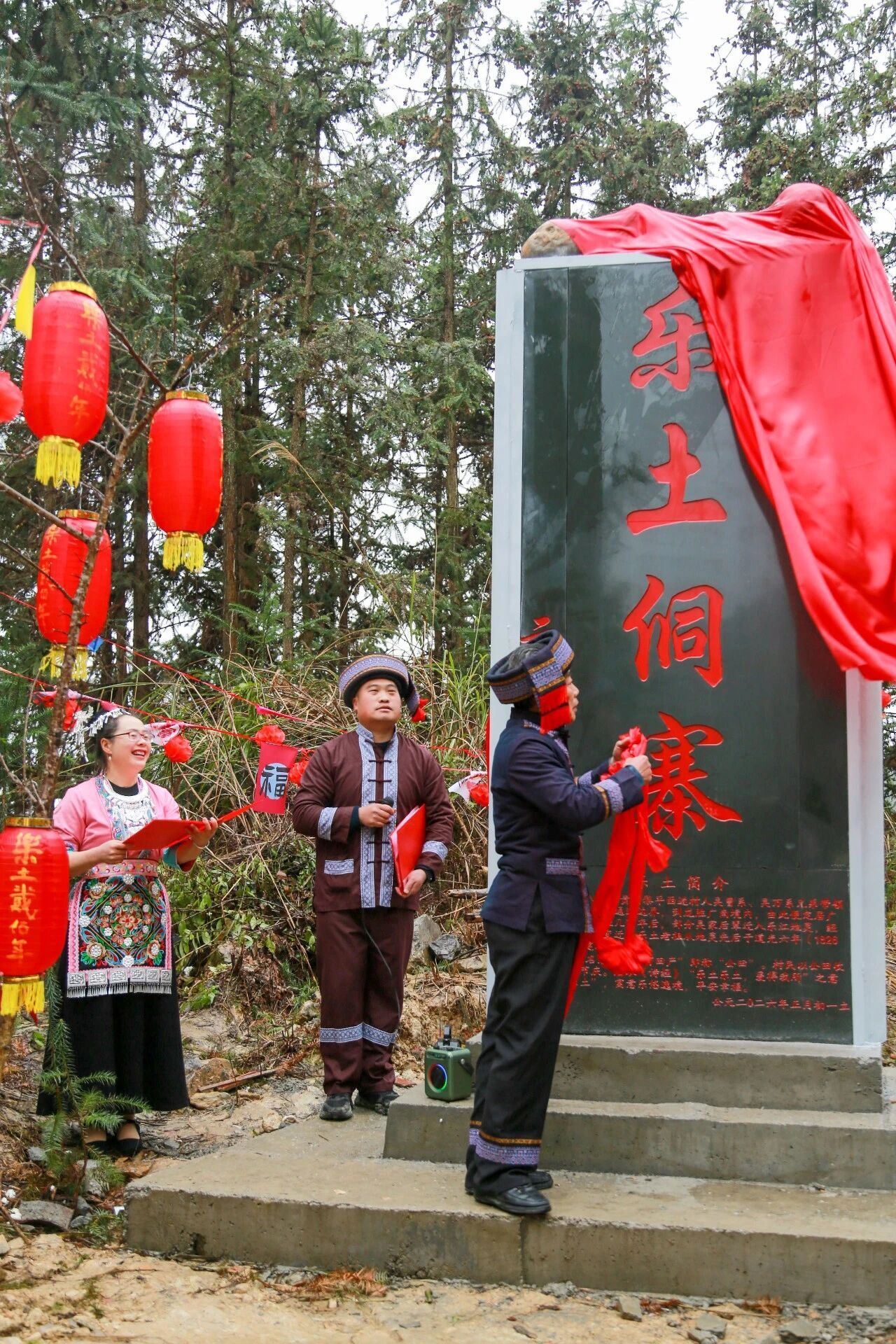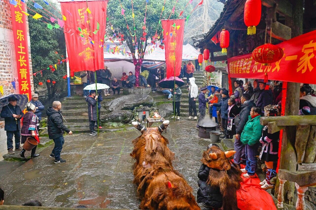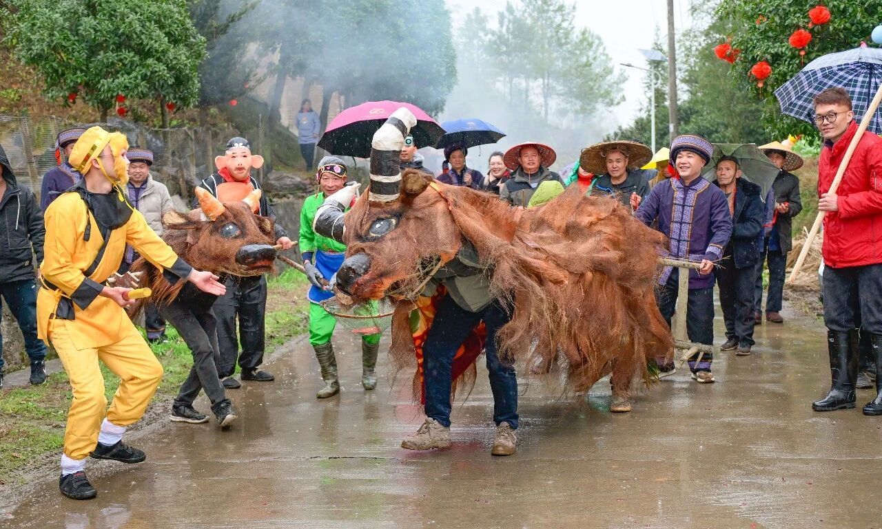 上午9点,公路尽头传来急促的锣鼓声。大家相聚在村头,共同为乐土侗寨揭牌,随着红绸落下,现场响起热烈的掌声,一头憨态可掬的“春牛”在人群簇拥下走入村寨——这是春天的序曲,也是侗家人对五谷丰登的千年祈愿。