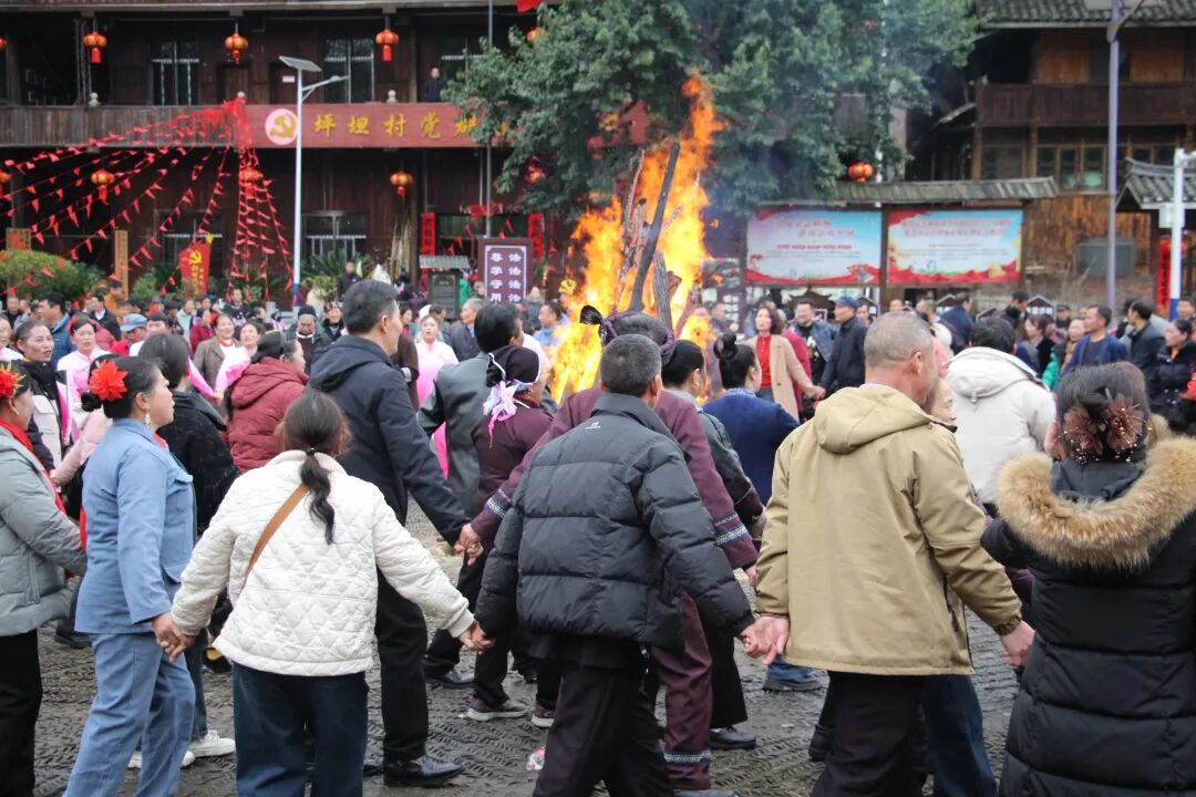 两村村民精心准备了极具侗族特色的文艺演出,非遗草龙、岩坪调轮番登场,吸睛无数;欢快的舞蹈、悠扬的芦笙琵琶亮点纷呈,赢得现场观众阵阵掌声、喝彩不断。演出最后,大家围聚在熊熊篝火旁,携手跳起热情的多耶舞,现场氛围热烈融洽,欢声笑语此起彼伏。