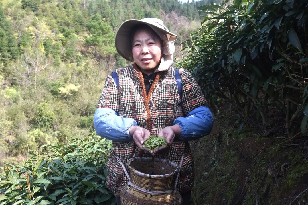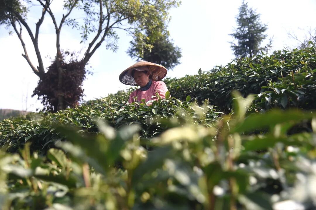在茶园采收现场,茶农们分散在各个茶区,他们头戴斗笠、腰挎竹篓,严格按照要求精心采摘,指尖在茶树间灵活穿梭,不一会儿就收获了满满一篓鲜叶。忙碌在茶园里的采茶工,都是来自周边村寨的村民,茶园的经营模式让村民们在家门口就能灵活就业。
