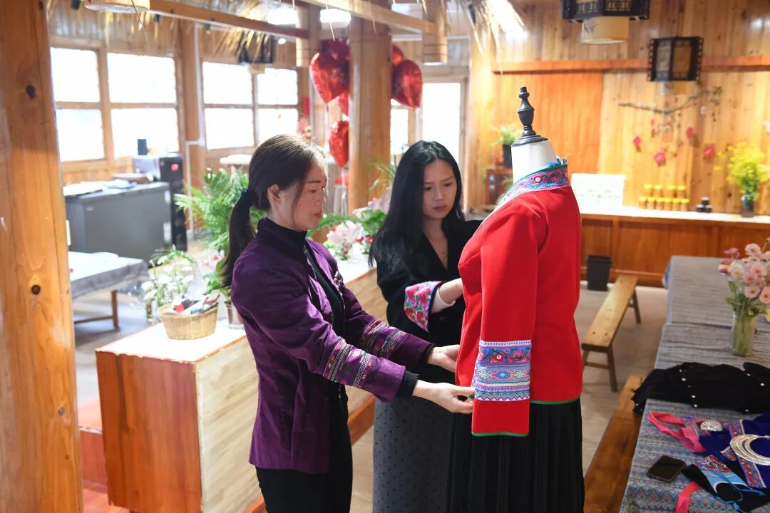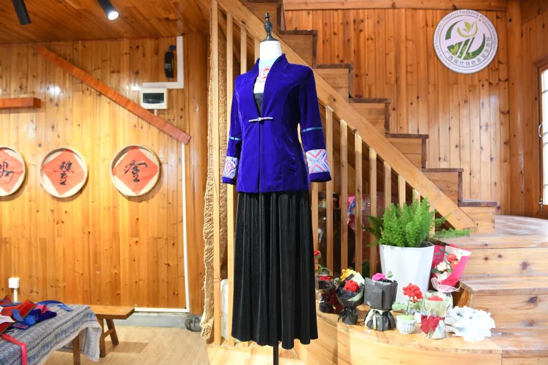 工作室是由两位土生土长的侗族姑娘王敏会、谢永骞创办的,怀着对家乡文化的热爱,她们选择回乡创业,把目光投向民族服饰的“日常化”探索。传统侗族服饰工艺精湛、纹样讲究,但因款式繁复、穿着场合有限,很难融入日常生活。她们尝试在保留侗锦、绣花等核心特色的基础上,简化版型、优化面料,让服饰既不失民族韵味,又更加轻便实穿,适合通勤、聚会等多种现代生活场景。